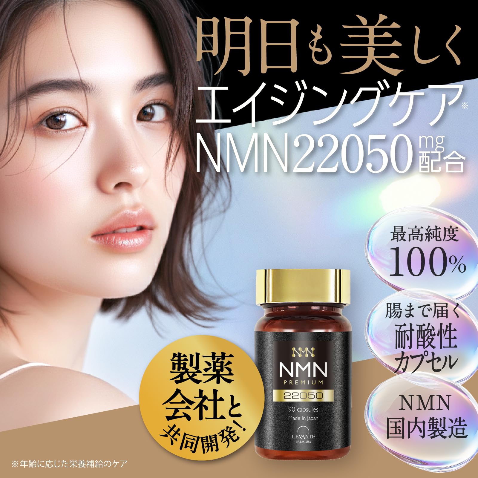 商品情報商品の説明主な仕様 【ハイクオリティのNMN】国内製造 NMN(ニコチンアミドモノヌクレオチド)を1本で「22,050mg」、3粒で735mgを摂取できます。また、業界最高クラスの純度100%(真正試験済み)、酵母発酵法で抽出されたβ-NMNを採用。さらに、第三者機関での検査も行われており、安心できる製品をお届けします。品質にこだわった次世代エイジングケアで毎日の健康をサポート。その他にも美しさをサポートするキダチアロエ(キダチアロエの葉)やスーパーフードのクロレラなどの美容成分も贅沢に配合。【耐酸性カプセル】飲みやすさと届けやすさにもこだわり、小型の「耐酸性カプセル」を採用。腸から吸収することで通常のカプセルよりも効率良く摂取することが可能です。 【第三者機関分析済み(配合量、純度)国内製造】第三者機関による分析試験済み。純度だけではなく、配合量検査も実施。NMNの純度と配合量がしっかりと第三者機関により証明されていますので安心してお飲みいただくことができます。【β型NMNのみを使用】NMNにはa型とβ型の2種類があり、世界で研究されているものはβ型です。レバンテのNMNはβ型のNMNだけを配合しています。 【酵母発酵法を採用】NMNの生成方法は酵母由来の発酵法と化学合成法がありますが、レバンテは「酵母発酵法」を採用しております。それにより不純物のない高純度な商品をお届けしています。【厳選した美容成分を配合】キダチアロエやクロレラ、レスベラトロール(トランス型)、還元型コエンザイムQ10、トリプトファン、ナイアシン(ビタミンB3)、ビタミンE、αリポ酸、ローヤルゼリーを選定。その他にも11種のビタミンや133種の果物・野菜の栄養素を配合。若々しく健康的な毎日をサポートします。【国内 GMP認定工場で製造】お客様に安心していただけるサプリをご提供できるよう、 徹底した品質管理のもと製造を行っております。 【内容量】:40.95g(455mg×90粒) 【お召し上がり方】1日あたり3粒程度を目安に、水またはぬるま湯などで噛まずにお召し上がりください。 【公式】レバンテオンラインストア以外を通して購入された場合は購入後のサポートやご質問を受けることが叶わないため、レバンテオンラインストアでの購入をおすすめしています。