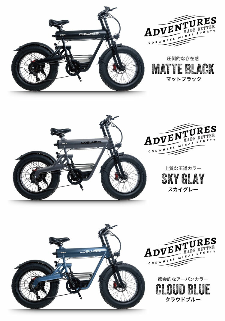 ■商品名:COSWHEEL MIRAI SPORTY 電動アシスト自転車 ■カラー・デザイン:○マットブラック(ACAL-coswheel-miraiSPORTY-BK)○スカイグレー(ACAL-coswheel-miraiSPORTY-GY)○クラウドブルー(ACAL-coswheel-miraiSPORTY-BL) ■サイズ(約):全長1,680×全幅570×全高1,030mm ■重量(約):34kg(バッテリーを含む) ■製品種別:電動アシスト自転車■モーター出力:48v/500w■サスペンション:フルサスペンション■タイヤサイズ:20”×4”■ギア:SHIMANO製7段変速■標準バッテリー最長航続距離:約80km-100km■標準バッテリー容量:15Ah■標準バッテリー充電時間:5時間■フレーム材質:アルミ合金A6061■シート高:890mm■適応身長:165cm〜■保証期間:1年 ■ブランド名:COSWHEEL(コスウェル) ■ご注意: ※防水に関して通常の雨であれば問題ございませんが、雨の中の長時間の放置はお控え下さい。極度に激しい雨や、人為的に水をかける行為で内部の電気回路が濡れた場合、あるいは道路が冠水した場合には故障する可能性があります。※稀に塗装のムラ、スチール製部品から薄いさび、梱包の跡などがあることがございます。これらの点についてのメーカー保証、返品、交換等は受けられませんので、許容できないという場合には、誠に恐れ入りますが、ご注文はお控えいただくようお願いいたします。 ※商品の色はモニターの具合で実物と若干異なる場合がございます。予めご了承下さい。 ※ご予約・お取り寄せ商品は、ご注文受付後にお客様ご注文分としてメーカーへ発注を致します為、基本的にキャンセルやご返品はお受けできません。 ※デザイン、仕様等につきましては、予告なく変更する場合がございます。予めご了承下さい。 ※ご注文後にメーカーへ在庫確認をさせていただきますため、万が一、メーカー都合により商品がご用意できない場合は、改めてご連絡差し上げます。誠に恐れ入りますがご了承くださいますよう、お願い申し上げます。 ※ メーカー直送商品について ※ こちらはメーカーから直接商品を発送いたします。 また、北海道・沖縄・その他離島は発送不可となります。 ※配送業者は変更となる場合がございます。 ※納期はご注文後(決済完了後)、都度確認いたします。 ※代引き払い、ラッピング、他商品との同梱はできません。 ※ご注文確定後のキャンセルは一切できませんので、予めご了承ください。COSWHEEL MIRAI SPORTY 電動アシスト自転車 滑りにくいオフロードタイヤを標準装備したモデル。 電動アシスト自転車「COSWHEEL MIRAI SPORTY」 滑りにくいオフロードタイヤを装着したモデル。オンロードはもちろん、オフロードや砂利道でに圧倒的に力強いパフォーマンスを実現。あらゆる路面状況を駆け抜けて楽しむことができます。●日本中を一世風靡したCOSWHEE E-MOTORCYCLE電動バイク・電動キックボードをはじめとしたCOSWHEEL MIRAI E-Motor Cycleは、美しいデザイン性、次世代を見据えて磨き上げた走破性などによって、日本中を一世風靡しました。 100%組立、点検済み より安全に、より快適に、より楽しく。MIRAI E-BIKEは国内工場で組立、整備後、100%完成した状態のMIRAIを全国のユーザー様にお届けします。ハイクオリティーの満足感・安心・楽しさも一緒にお届けします。 製品特徴 ●オフロードタイヤを標準装備オフロードタイヤがもたらす、貴方だけの至高のスポーティネス。●前後サスペンション前後サスペンションがこの上なく快適な走行と優れたドライビングダイナミクスを実現します。●油圧式ディスクブレーキしっかりと止まる。だからこそ楽しめる。前後共に制動力抜群な「油圧式ディスクブレーキ」を標準装備。従来の機械式ブレーキに代わる電動バイク性能並の前後油圧式ディスクブレーキ。COSWHEEL MIRAI E-BIKEをより安全に、より快適に、より楽しくお乗りいただけます。●標準装備:15Ahバッテリー約80~100km 走行可能。※電動という特性上、気温や荷重に左右されます。 バリエーション ○マットブラック○スカイグレー○クラウドブルー からお選びください。 ご注意事項 ●保証範囲本製品が保証期間内に正常な使用状態でに保証規定により1年間の修理または交換対応をいたします。※部品代は弊社が負担いたしますが、工賃と送料はお客様負担となります。保証対象外となる項目は以下のような場合があります。1.製品保証書が無い場合。もしくは中古車販売、個人売買により製品を所有した場合。2.取扱上での輸送中の落下、取扱が不適当なため生じた故障並びに損害の場合。3.他製品を接続した事による故障、動作確認を行っていない機器やケーブルを接続したことによる故障の場合。4.不適当な使用環境、保管状況によって起こる故障、消耗品の交換。5.砂利、砂利道等の舗装されていない道路を長期間走行したことによって発生した部品の不良、故障、部品の損傷。6.経年劣化によって発生する不具合(塗装面の剥がれ、メッキ部分のサビ等)7.走行上問題の無い、使用環境、使用状態、保管状況によって左右される現象(音、振動、バッテリー充電容量の低下)。8