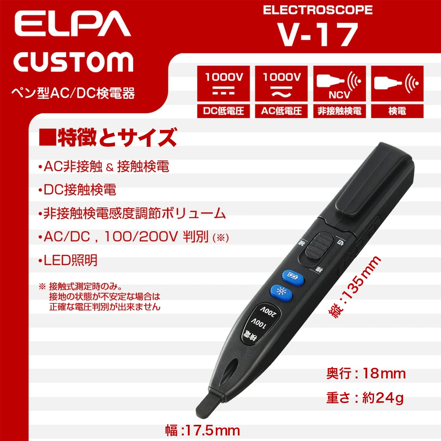 商品情報商品の説明非接触式(AC)と接触式(AC)の通電状況を簡単操作でチェックするペンタイプの検電計です。 非接触式測定時に感度調節が可能なボリューム付き。 AC100V/200Vの電圧判別機能付き。(接触式測定時のみ。接地の状態が不安定な場合は正確な電圧判別ができません。) 暗所で便利なLEDライト付き。主な仕様 接触式電圧検出範囲:AC7V~1000Vbr 非接触式電圧検出範囲:AC30V~1000Vbr インジケータ:検電LED:非接触モード時 AC30V~1000Vの電圧を検出した際点灯 100V LED:接触モード時 AC7V~約125Vの電圧を検出した際点灯 200V LED:接触モード時 AC約125V~1000Vの電圧を検出した際点灯brbr感度調整機能:本体裏面のボリュームにより検出電圧の感度調整が可能(非接触モード時のみ有効) 絶縁耐圧:AC2000V/1分間(検知部-スイッチ間) 照明機能:LEDボタンを押すたびにLEDライトのON/OFFが可能brbr使用温湿度:0度~+40度、75%RH以下(但し、結露のないこと) 保存温湿度:-10度~+50度、75%RH以下(但し、結露のないこと) 電源:LR44ボタン電池X2個(テスト用 内蔵) 外形寸法(約):W17.5XH132XD18(mm) 質量:約24g(電池含む)