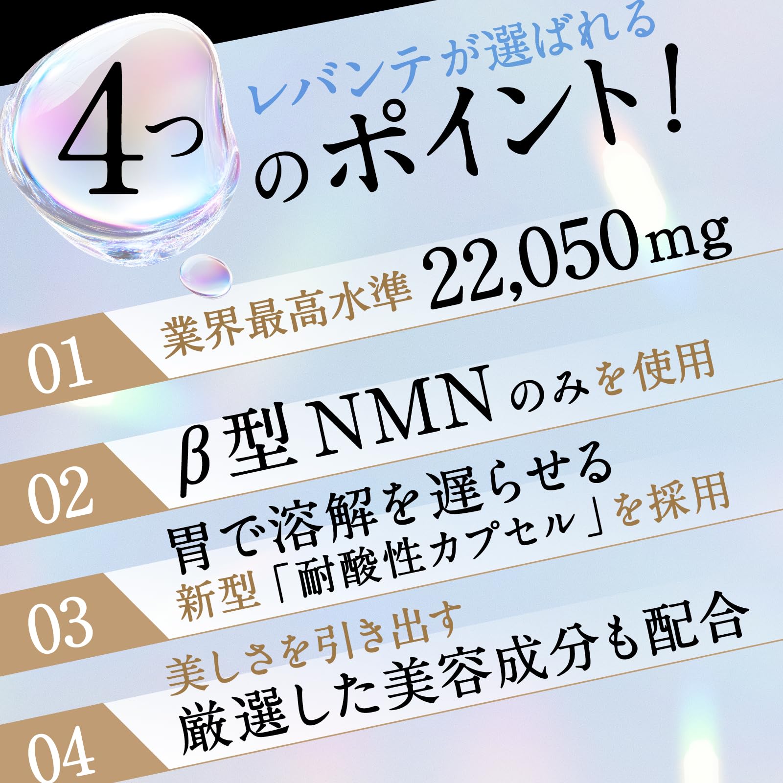 商品情報商品の説明主な仕様 【ハイクオリティのNMN】国内製造 NMN(ニコチンアミドモノヌクレオチド)を1本で「22,050mg」、3粒で735mgを摂取できます。また、業界最高クラスの純度100%(真正試験済み)、酵母発酵法で抽出されたβ-NMNを採用。さらに、第三者機関での検査も行われており、安心できる製品をお届けします。品質にこだわった次世代エイジングケアで毎日の健康をサポート。その他にも美しさをサポートするキダチアロエ(キダチアロエの葉)やスーパーフードのクロレラなどの美容成分も贅沢に配合。【耐酸性カプセル】飲みやすさと届けやすさにもこだわり、小型の「耐酸性カプセル」を採用。腸から吸収することで通常のカプセルよりも効率良く摂取することが可能です。 【第三者機関分析済み(配合量、純度)国内製造】第三者機関による分析試験済み。純度だけではなく、配合量検査も実施。NMNの純度と配合量がしっかりと第三者機関により証明されていますので安心してお飲みいただくことができます。【β型NMNのみを使用】NMNにはa型とβ型の2種類があり、世界で研究されているものはβ型です。レバンテのNMNはβ型のNMNだけを配合しています。 【酵母発酵法を採用】NMNの生成方法は酵母由来の発酵法と化学合成法がありますが、レバンテは「酵母発酵法」を採用しております。それにより不純物のない高純度な商品をお届けしています。【厳選した美容成分を配合】キダチアロエやクロレラ、レスベラトロール(トランス型)、還元型コエンザイムQ10、トリプトファン、ナイアシン(ビタミンB3)、ビタミンE、αリポ酸、ローヤルゼリーを選定。その他にも11種のビタミンや133種の果物・野菜の栄養素を配合。若々しく健康的な毎日をサポートします。【国内 GMP認定工場で製造】お客様に安心していただけるサプリをご提供できるよう、 徹底した品質管理のもと製造を行っております。 【内容量】:40.95g(455mg×90粒) 【お召し上がり方】1日あたり3粒程度を目安に、水またはぬるま湯などで噛まずにお召し上がりください。 【公式】レバンテオンラインストア以外を通して購入された場合は購入後のサポートやご質問を受けることが叶わないため、レバンテオンラインストアでの購入をおすすめしています。