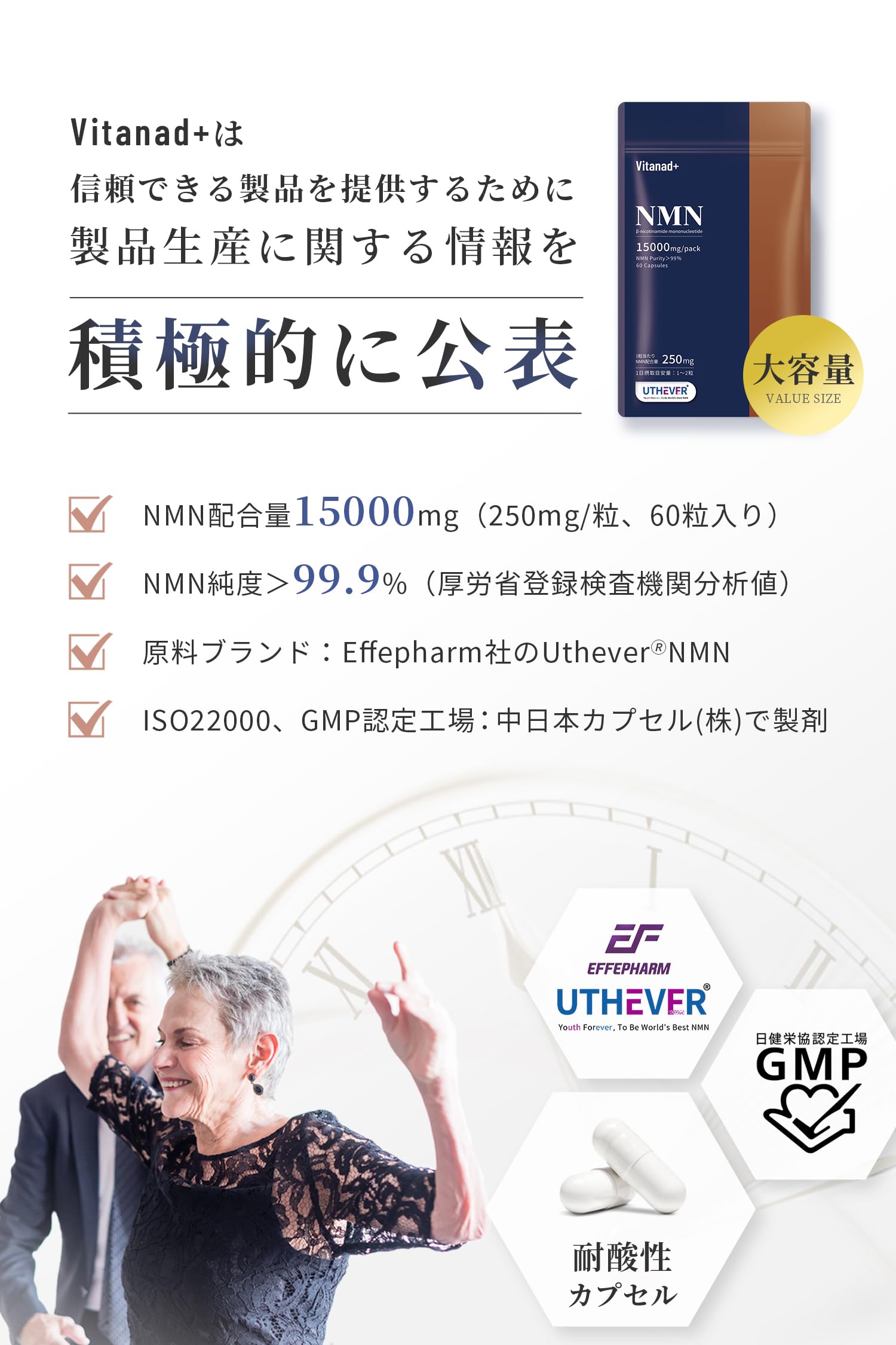 商品情報商品の説明主な仕様 【NMN15000mg/袋、250mgx60粒】1回の目安量:1〜2粒【Uthever品質】GMP及びUSP(米国医薬国家基準)の品質基準に準拠して生産し、WHOならびに米国の臨床データベースにおいて、検体数の多いNMN臨床実験を実施したNMN専門企業Effepharm Ltd.のNMN原料「Uthever」を採用しています。【純度99.9%以上】アメリカ第三者試験機関Interket、Micro Quality Las、Agilent Technologyによる純度認証だけではなく、日本厚労省登録検査機関でも純度99.9%以上の結果が出ています(JFIC日本食品検査- 第721G061812号)【日本国内生産】食品安全国際規格ISO22000、健康補助食品GMP認証を取得した、約30年の歴史を持つ国内生産工場(中日本カプセル株式会社)で製剤化。【NMN含有量分析】国内で製剤化されたVitanad+のNMNサプリメントは、生産ロットごとに日本厚労省登録検査機関で検査を受けており、1粒あたりのNMN含有量が250mg以上であることが確認されています(最新ロットの分析番号:日本食品分析センター第25029496001-0201号/発行日:2025年4月16日)