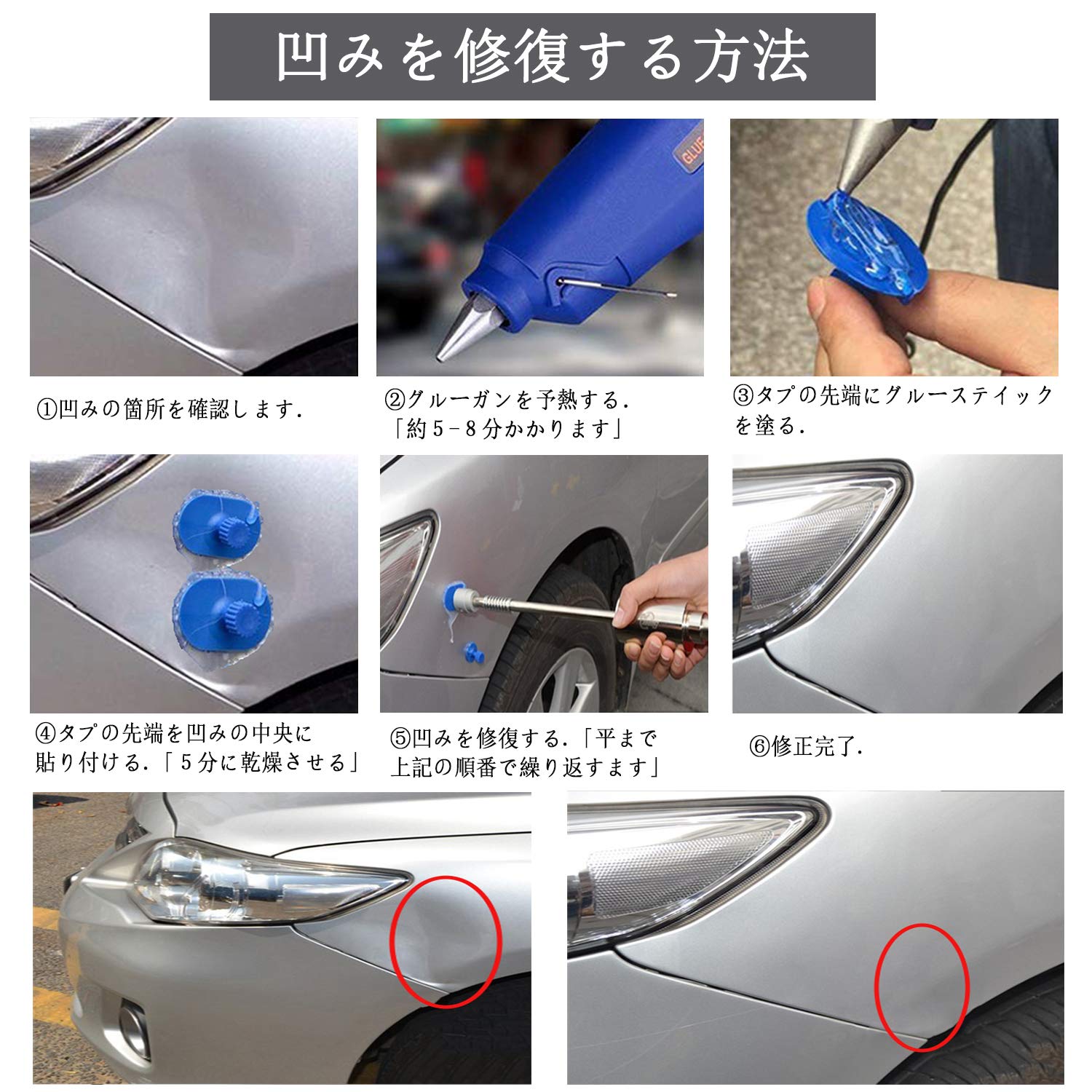 商品情報商品の説明主な仕様 包装内容:Tバーx1、タブx28、ホットメルト10pcs、シャベルx1cs、プラスチック瓶(空)x1、財布x1、 日本語作業指示書x1。brメリット:1早くて、綺麗で愛車の車体を修復します。2無塗装の修理なので、オリジナルの塗装を守ります。3パテを使わない、再塗装もしないので、環境にとっても良いです。br修理工場の普通修理は数日間が掛かりますが、今はそなん必要がなく、自分で簡単に作業し、短時間で凹み直しが可能です。気になる凹みをパテも塗料も使わず簡単に補修が出来ます。愛車を綺麗に手入れします。br応用範囲:車、バイクのボディ&フェンダーの補修や、ドア、冷蔵庫、洗濯機などの凹み修理ができます。凹みの大きさによってタブを利用してください。br注意事項:1使用の際に、グル—ガンは別途購入が必要です;2大き過ぎる凹み、小さすぎる凹み、鋭角についている凹み、プレスラインにかかっている凹み等に関しては修復不可な場合がございます。3これはDIYの簡単作業で100%完全な修復をされないです。作業方法と個人的原因によって、修復効果も違います。