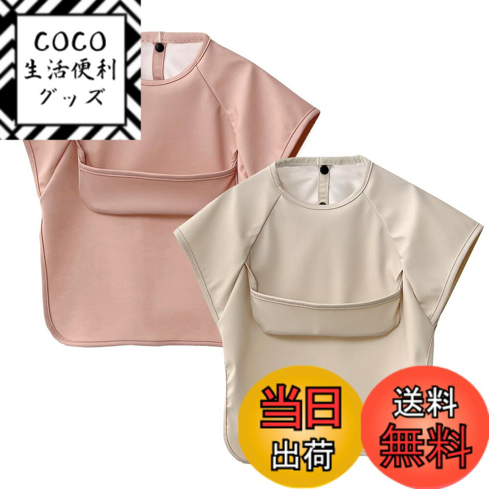 【送料無料】[GoUseGo] お食事エプロン ベビー 半袖 離乳食エプロン 2枚セット 防水 食事用エプロン 防水 赤ちゃん 食事スタイ 女の子 男の子 幼児用 エプロン 1歳 2歳 3歳 4歳 5歳 6歳 スモック 子供 キッズ 保育園 幼稚園用 色:ピンク/ベージュ、サイズ:M