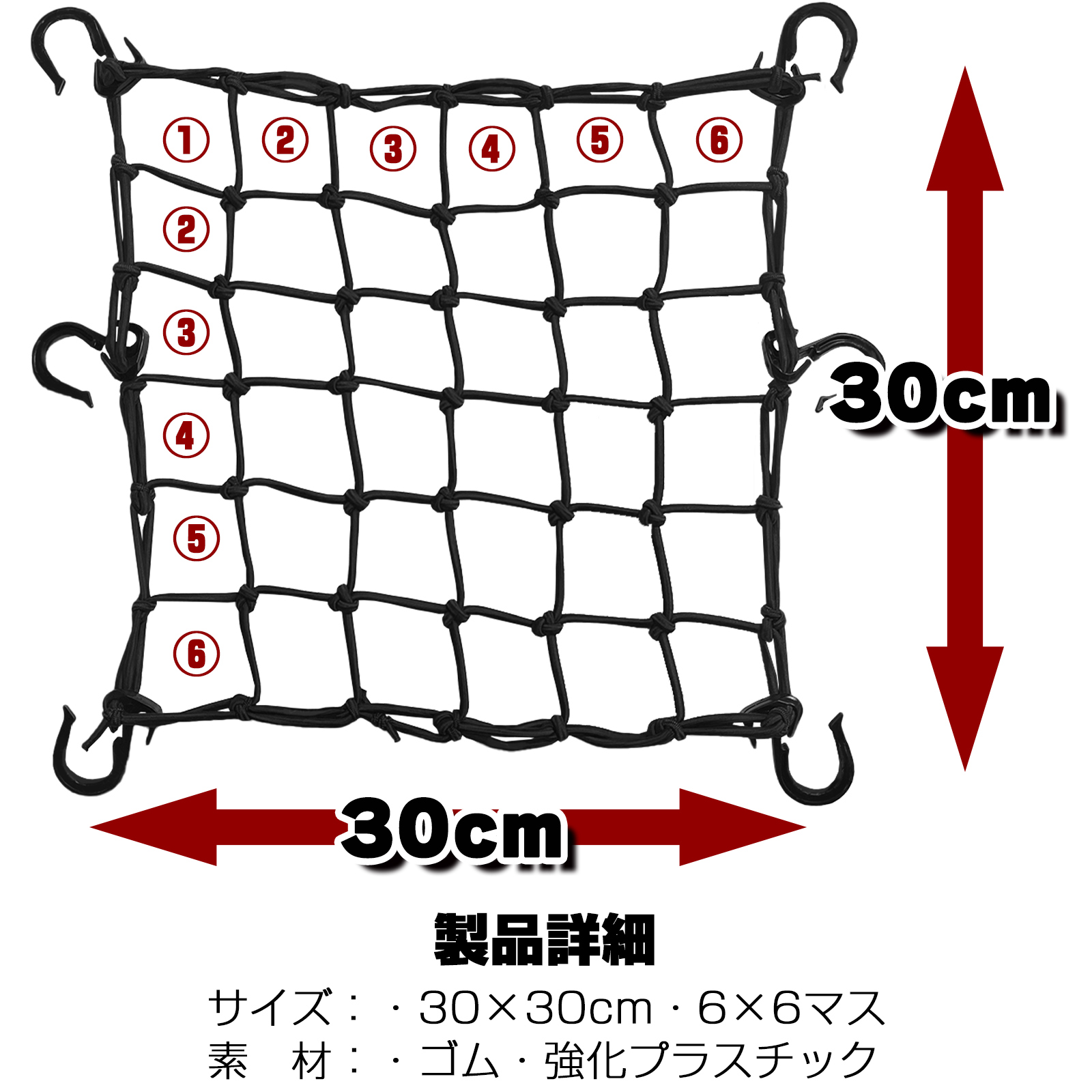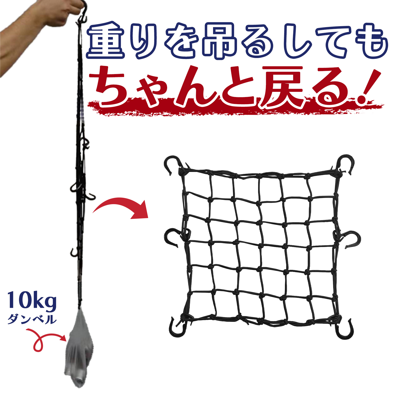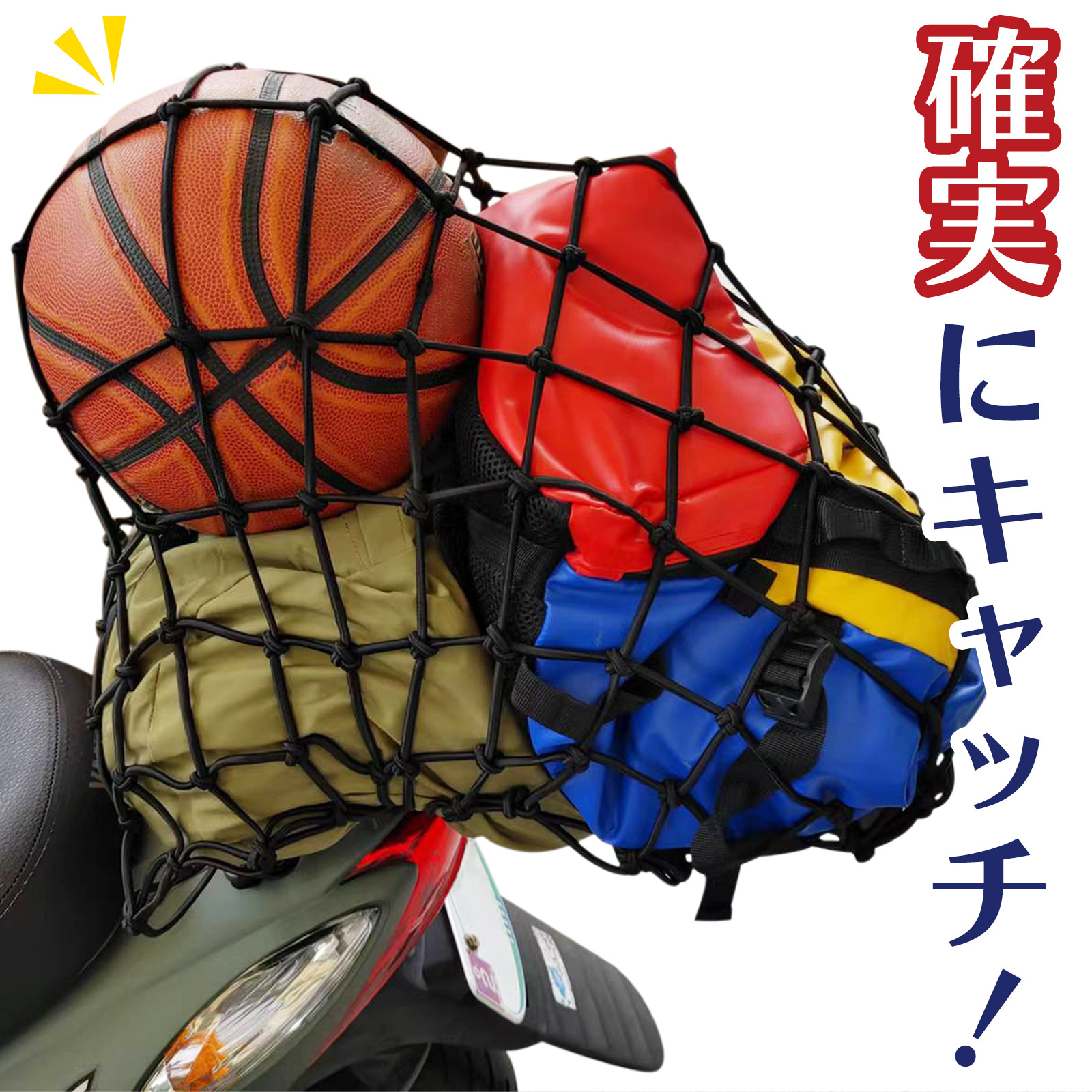 強力ゴム採用の高耐久ネットで、かばん・箱・ヘルメットなどの荷物をまとめてしっかり固定。