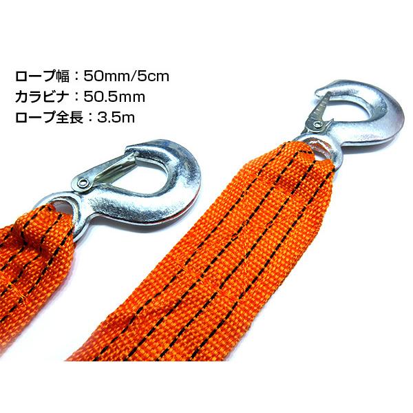 フック付き 牽引ロープ 3t 3トン 3.5m けん引ロープ 50mm幅 5cm オフロード レスキューロープ カラビナ シャックル オレンジ 固定ベルト