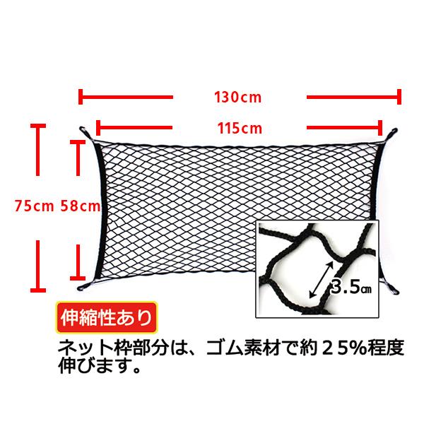 【送料無料】※ポスト投函の為、日時指定不可※お届けまでに2日程、離島の場合は1週間程、配達日数をいただきます。※厚さに制限があるため、梱包は簡易なものになります、ご了承ください。■カーゴネット 130cmx75cmネットのサイズは、およそ115cmx58cmフックからフックまでの長さ およそ130cmx75cm外周部分の材質はゴムなので伸縮します。様々な幅やサイズにご利用できます。ネットは2.5mmナイロン製、ネットの上下には4.5mmのゴムひもが使われています。網目の間隔は、およそ3.5cmと狭く、しっかりと荷物を保持します。縦に使用することも、平らに敷いて使用することもできます。スノーボード、ゴルフバッグ、ラケットバッグなどをミニバンに縦積み出来ます。伸縮性と柔軟性に富んだカーゴネット。固定する箇所の位置が良ければ、純正オプション、純正パーツのような使い勝手になります。車用ネット類には、「標準ネット」「網目二倍ネットW」「カーゴネット」などの取り扱いがございます。