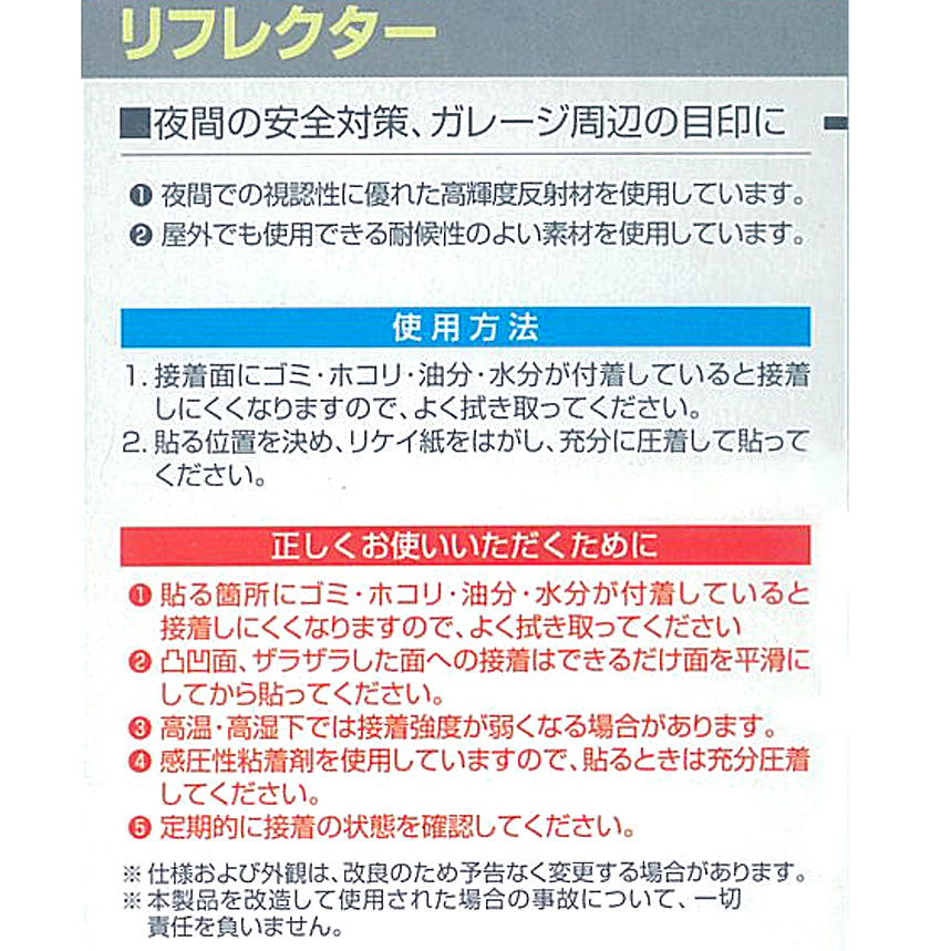 | ◆夜間の安全対策、車・ガレージ周辺の目印に ◆ブロック塀やカーポート支柱などの屋外使用に ◆国土交通省認定品『NO.(二)R-418』 ◆夜間での視認性に優れた高輝度反射材を使用 ◆屋外でも使用できる耐候性のよい素材を使用 ◆粘着テープ付 ※画像はイメージです。実際の商品とは異なる場合がございます。 ※パッケージにつきましては、メーカーの仕様変更等により予告なく変更になる場合がございます。パッケージの違いによる返品・交換は承っておりませんので予めご了承ください。 | |