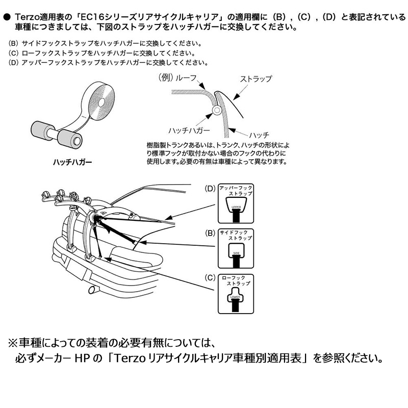 TERZO製 サイクルキャリアEC16シリーズのオプションです。標準装備のフックが取付できない場合、フックの代わりにトランク、車内側に入れキャリアを固定できます。