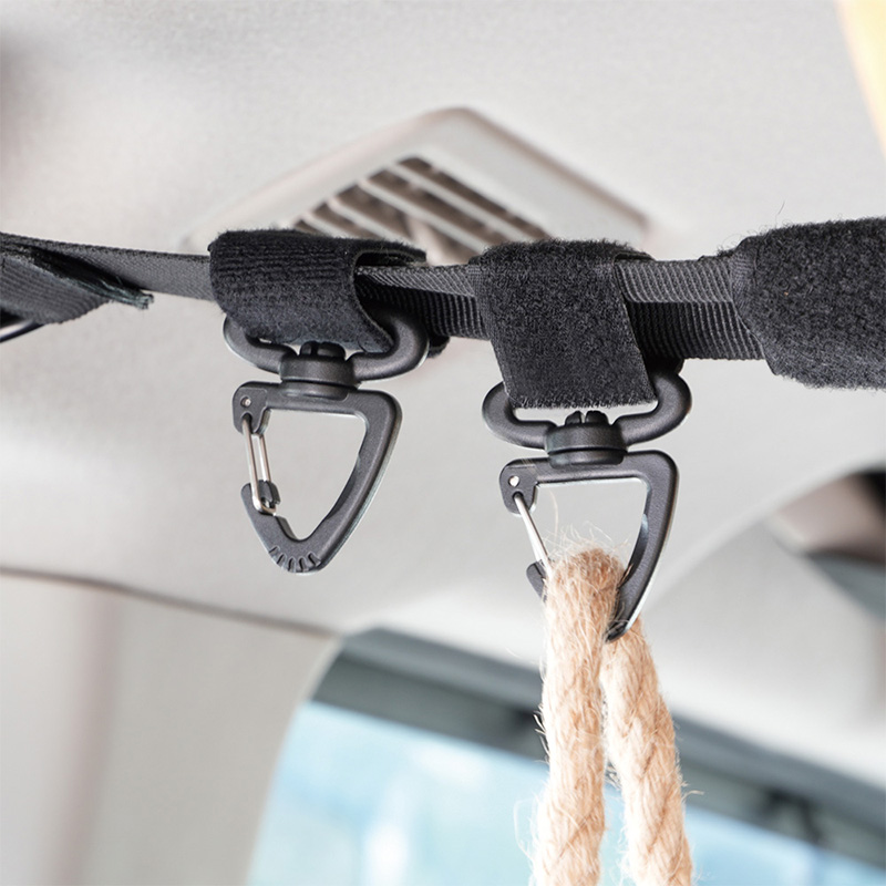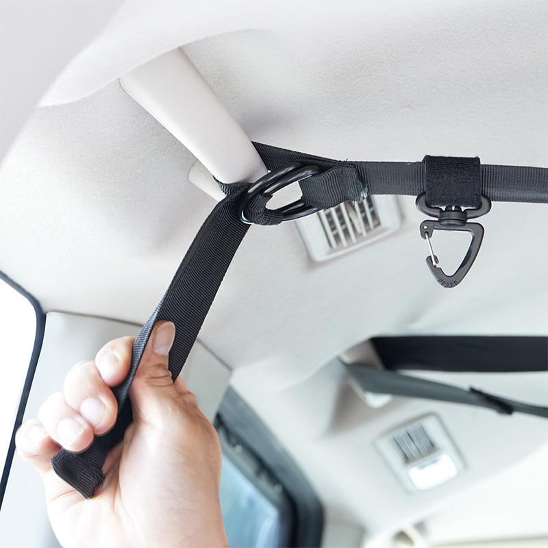 3箇所(前後左右)のアシストグリップを利用して取り付けるハンギングベルト。サーフボード等の長尺物を積載&小物等を吊るして収納可能。安定した積載を可能にする50mmの幅広ベルト採用。