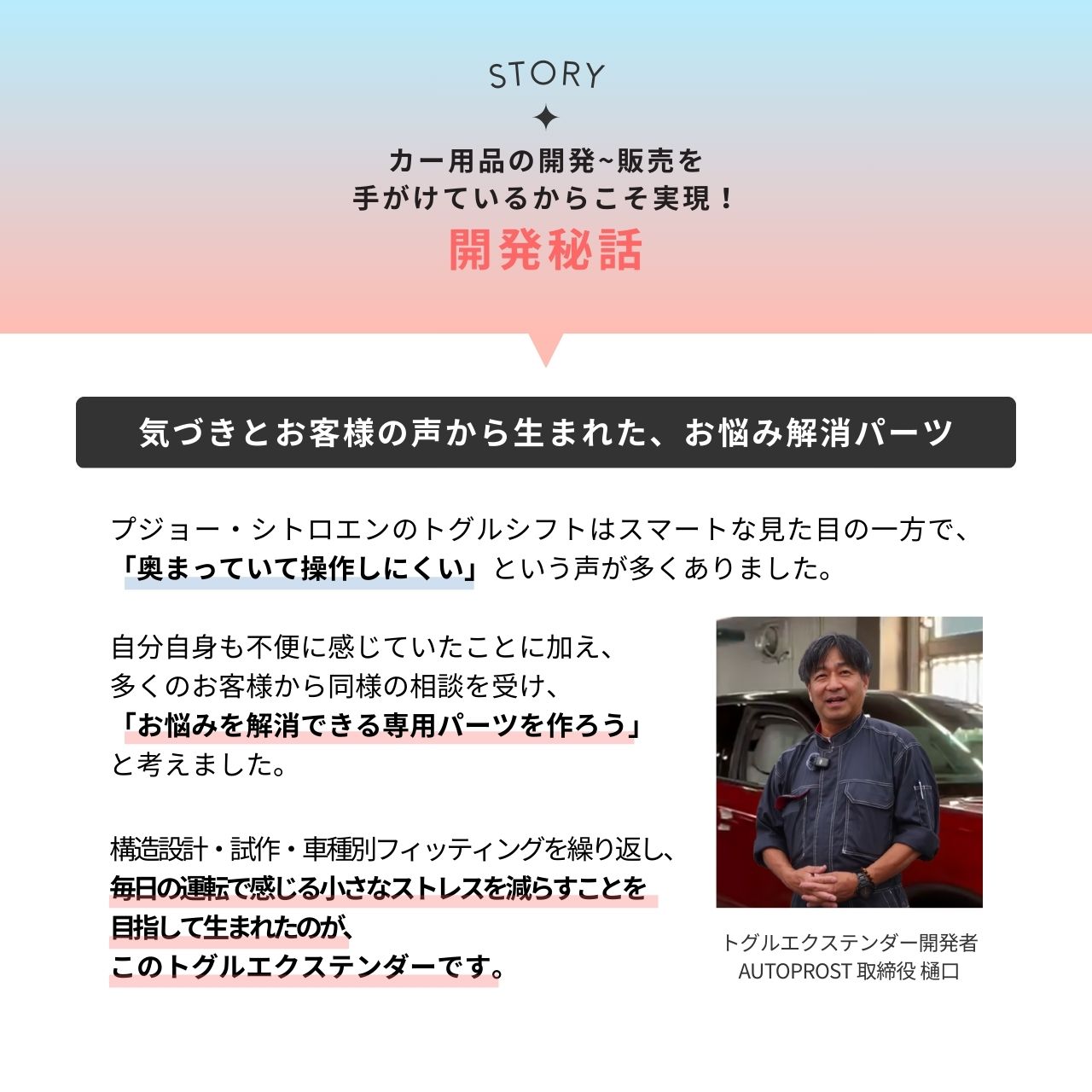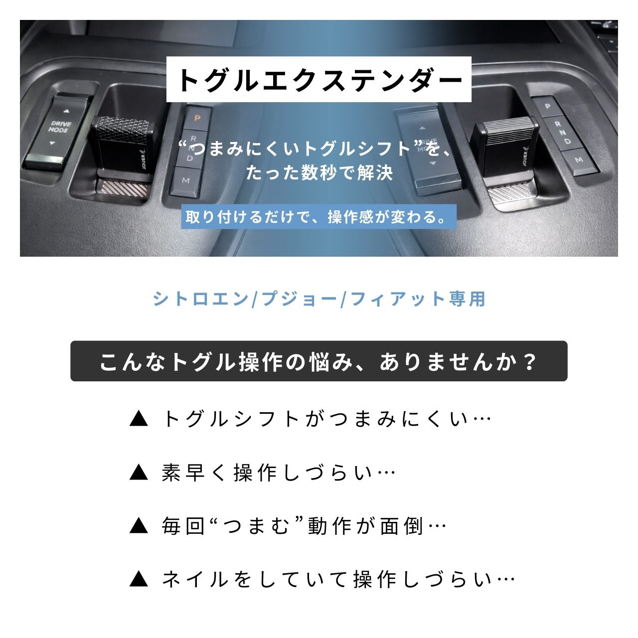 プジョー/シトロエン/フィアットのトグルシフト採用車向けに設計されたお悩み解消パーツです。