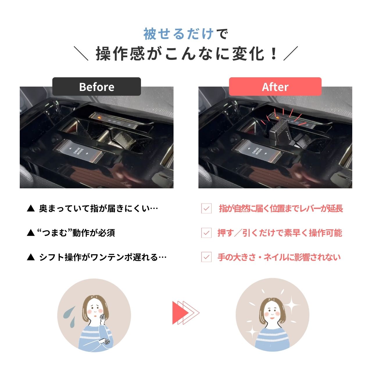 純正トグルシフトに被せるだけで、押す・引くだけのスムーズなシフト操作が可能になります。