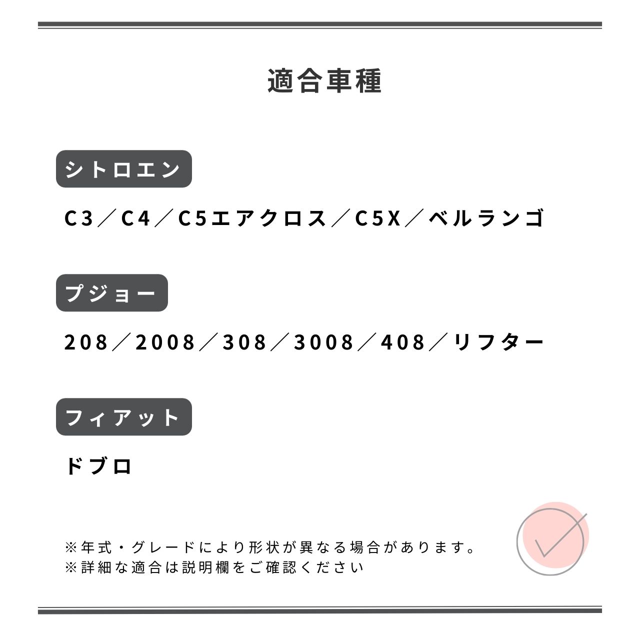 ※適合がご不安な場合は、ご購入前に車検証情報(車種名・年式など)を添えてお問い合わせください。