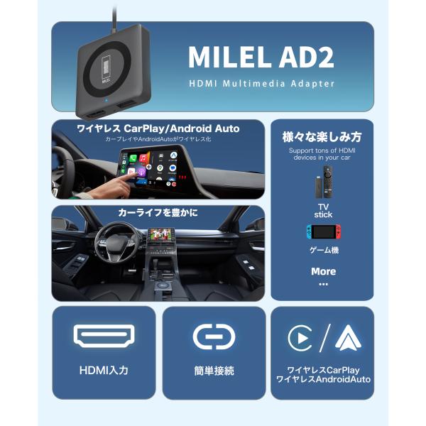 MILEL AD2 ミレル Car TV Mate Proカーテレビメイト HDMI出力のTV stick/DVDなど接続可能 ワイヤレスAppleCarPlay iPhone対応可能 【技適取得済み品】