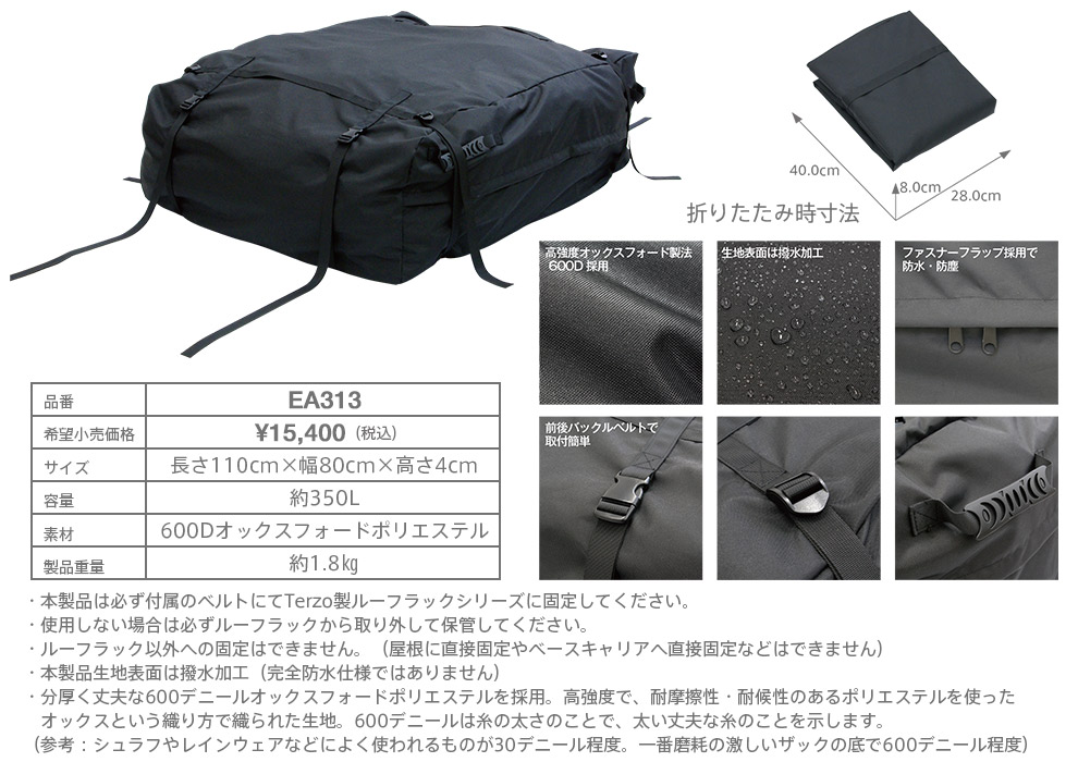 | ※本製品は必ず付属のベルトにてTerzo製ルーフラックシリーズに固定してください。 ※使用しない場合は必ずルーフラックから取り外して保管してください。 ※ルーフラック以外への固定はできません。(屋根に直接固定やベースキャリアへ直接固定などはできません。) ※本製品の生地表面は撥水加工ですが、完全防水仕様ではありません。 ※商品ならびに価格は改良のため、予告なく変更する場合があります。また、上記の設定車種は予告なく販売を中止する場合があります。 ※お客様の見落としや確認ミスでのキャンセル・交換・返品は一切お受けできません。 ※商品画像は代表車種の物です。車種毎に形状は異なります。 ※適合情報は随時更新しておりますが、告知なくメーカー側にて更新される場合がございますので、必ずご注文前にメーカー適合表にて最新の適合表をご確認頂ますようお願い致します。 |
