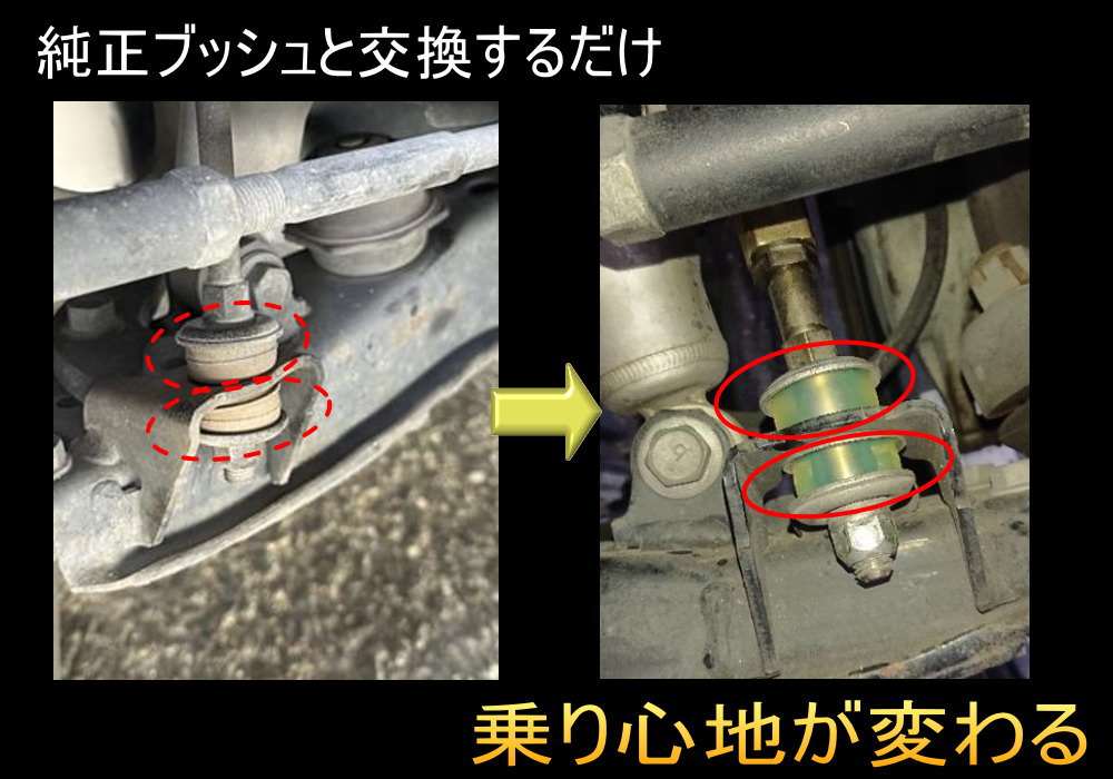 強化ブッシュに交換するメリット ・ステアリングを切った時の反応が良くなり、乗り心地が良くなる ・ハンドリングが軽くなる ・不快な異音が解消 ・ふらつきが解消し、直進安定性が向上する 結果、乗り心地が良くなります!