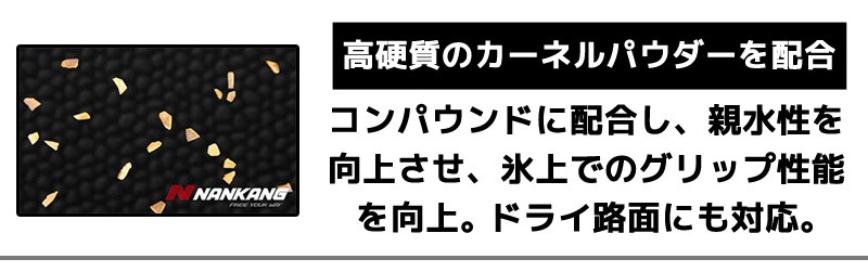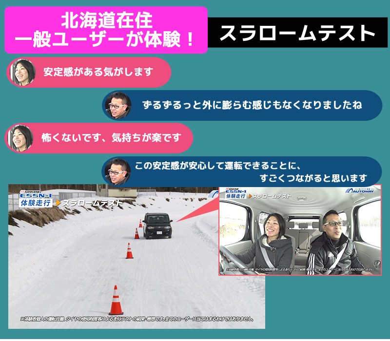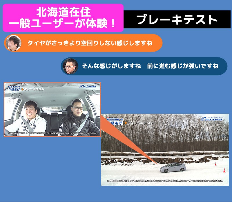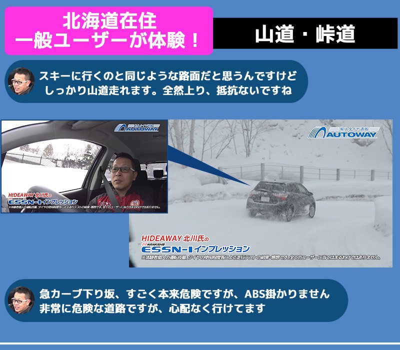 ■ESSN-1(イーエスエスエヌワンは、強力な氷雪上性能を発揮するスタッドレスタイヤです。トレッド面の材質に天然カーネルパウダーを使用する事で、氷上での摩擦力を強め、冬季のあらゆる路面で優れた性能を発揮し、コーナリング性能、直進安定性、快適性にも優れています。