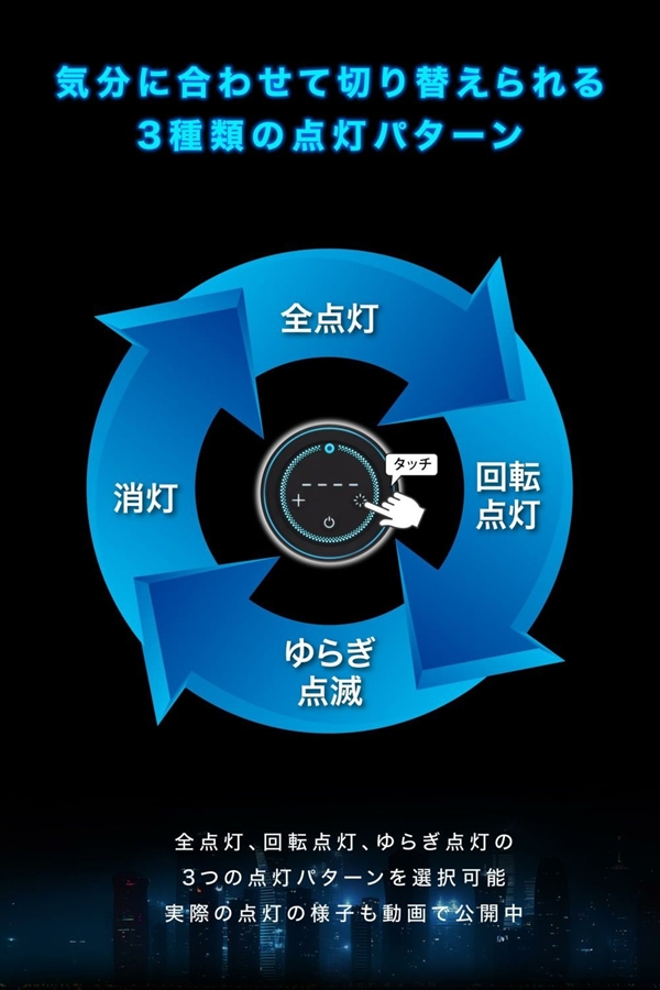 全点灯、回転点灯、ゆらぎ点灯の3つの点灯パターンと消灯モードを搭載。