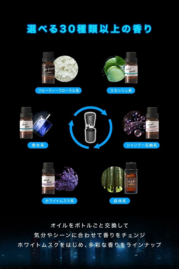 ボトルを交換するだけで、簡単に香りをチェンジできるので、気分やシーンに合わせて香りを選べます。