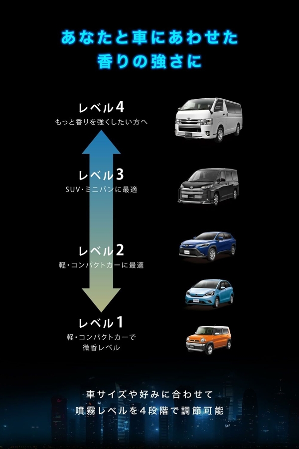 レベル4で使用すれば、芳香剤を何個も使わないと香りが楽しめなかったミニバンなどの大型車もこれ一台で充分に香りをいきわたらせることができます。