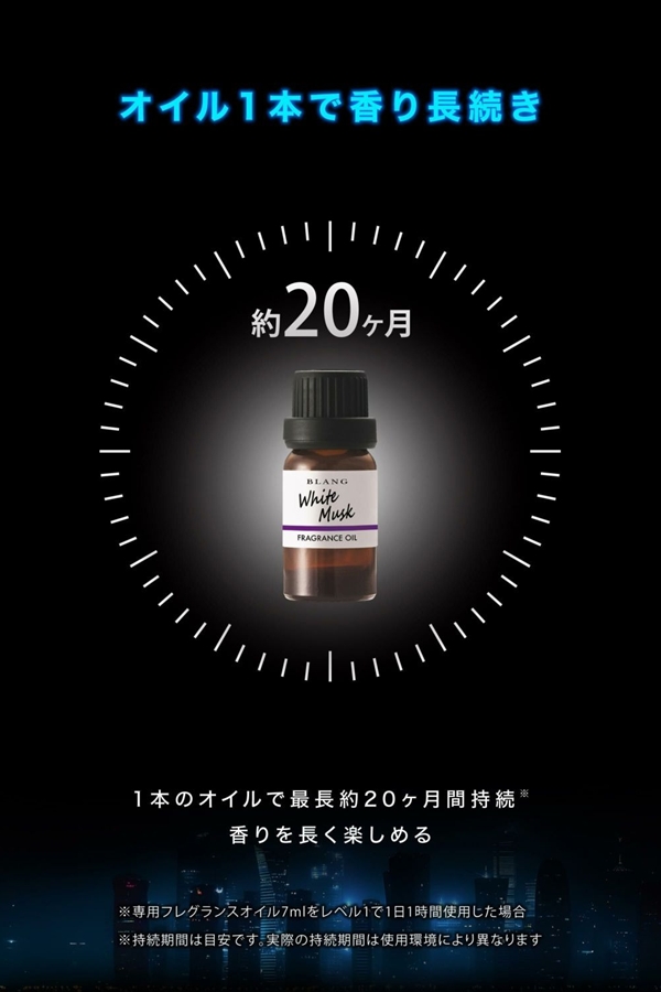 専用フレグランスオイル7mlをレベル1で1日1時間使用した場合、最長で約20ヶ月香りが持続します。