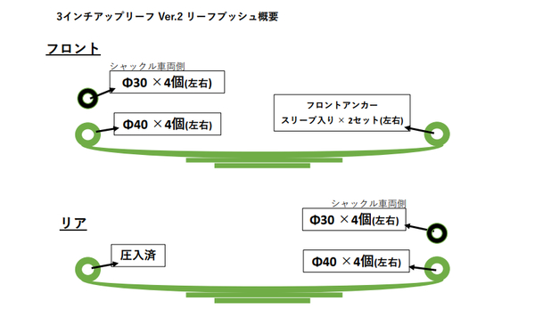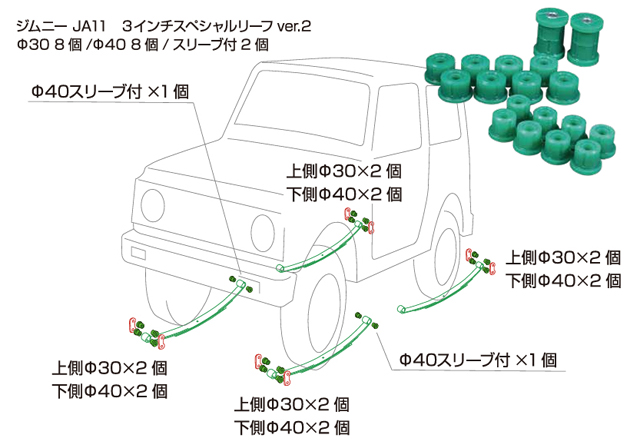 | 製品特徴 | ウレタン製 スパイラルブッシュ JA11用スパイラルブッシュが1台分揃ったセットです セット内容 ・フロント アンカー スリーブ付 × 左右分 2個セット →フロントリーフの付け根側のブッシュ ・30パイ 8個 →シャックル側 分割式なので一ヶ所で2個(一台分で8個) ・40パイ 8個 →リーフ側 分割式なので一ヶ所で2個(一台分で8個) |
