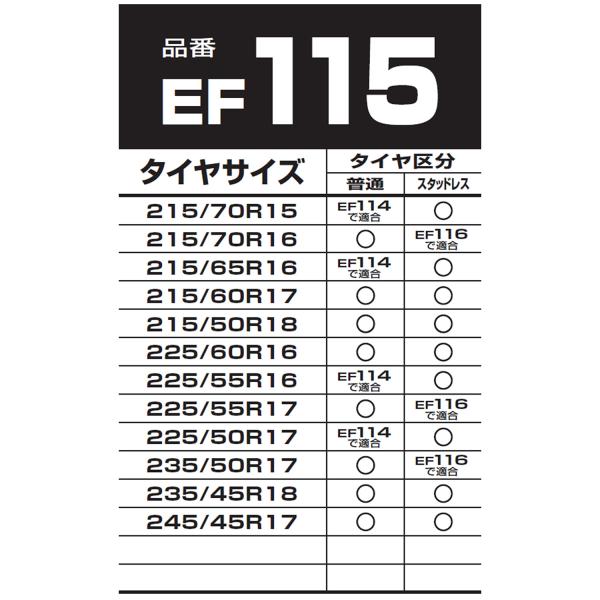 | タイヤサイズ | 普通タイヤ/オールシーズンタイヤ | スタッドレスタイヤ | 215/70R15 | EF114で適合 | 〇 |