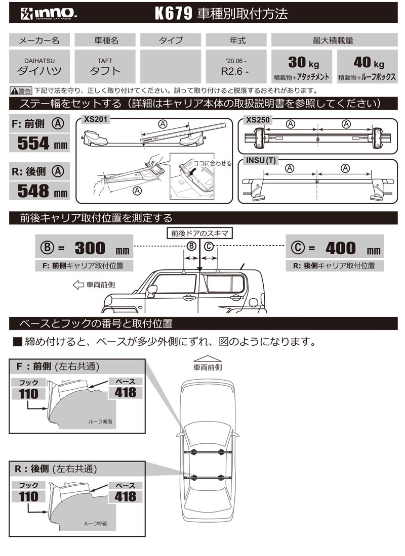 K679 取付フック ダイハツ タフト フラッシュレール無 R2.6〜 型式 LA900S / LA910S イノー システムキャリア ベースキャリア carmate