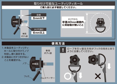 ・車両のM6サイズ用ユーティリティホールを利用して増設できるフックです。