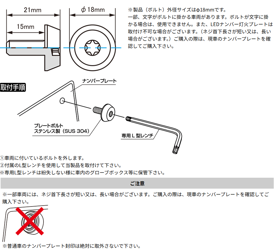 ●本体プレートボルトは、耐食性抜群のステンレス製(SUS304)。 ●シンプルな形状で、高級なイメージを演出。カラーは、ブラッククロムメッキ。 ●取り付け取り外しは、盗難抑止トルクス形状。 ●3個入(普通車用)、4個入(軽自動車用)パッケージを設定しました。 |