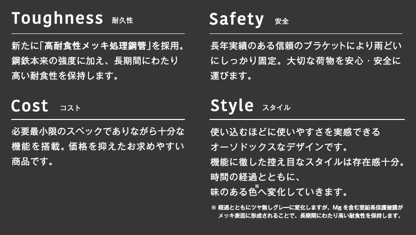・長年実績のある信頼のブラケットにより雨どいにしっかり固定。大切な荷物を安心・安全に運びます。