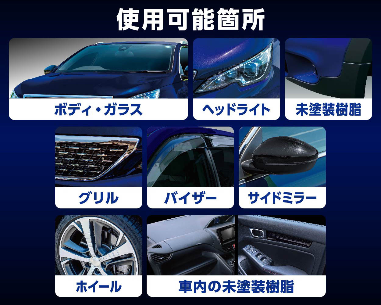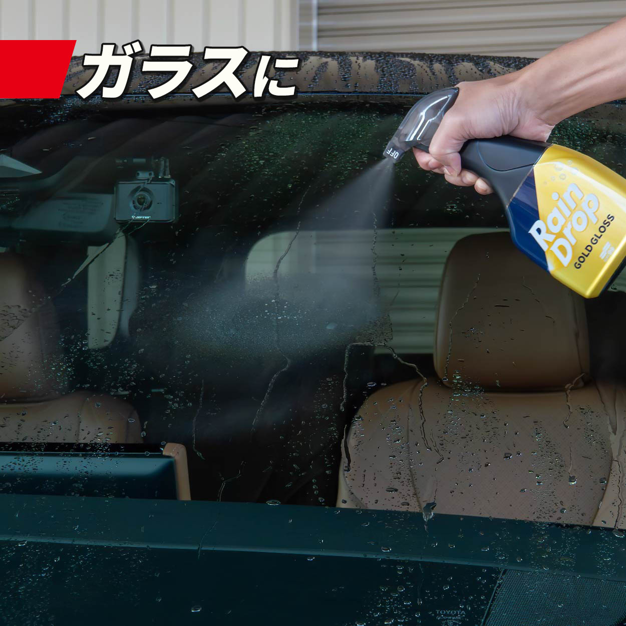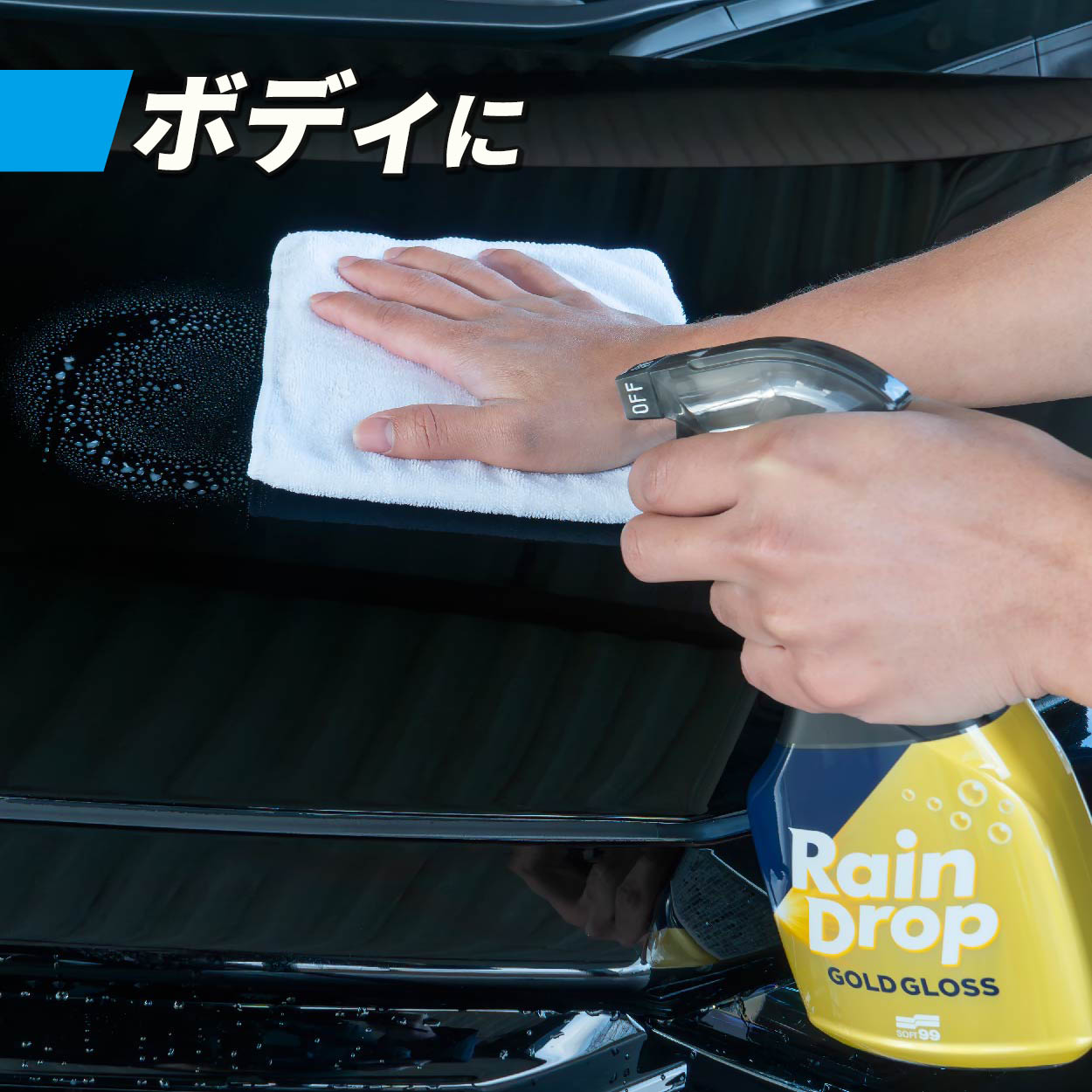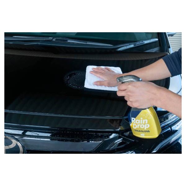 素材が異なる「塗装面」「ガラス面」どちらに対しても、『レインドロップ ゴールドグロス』1本でコーティングが完了。車の外装に多く利用される樹脂素材にもお使いいただけます。