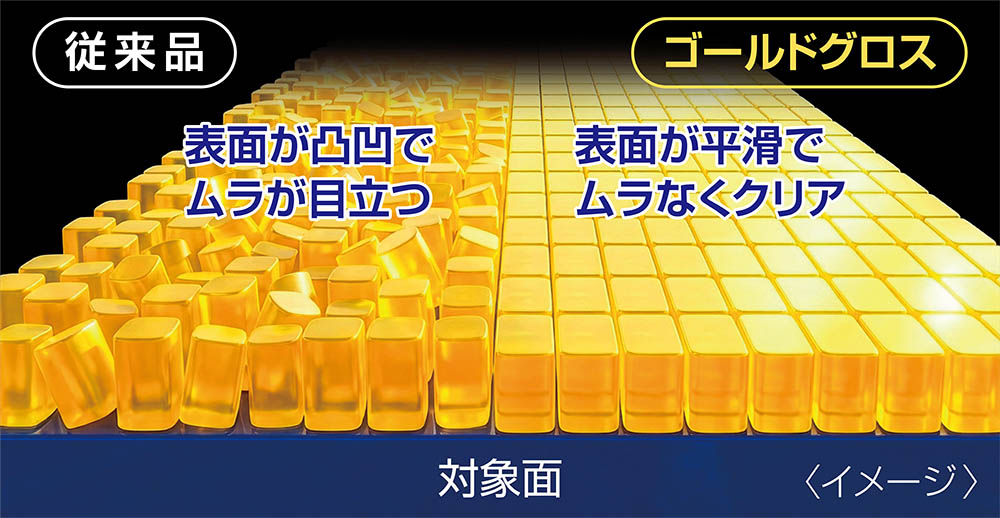 新開発「SELF SMOOTHING処方」により、最小限の拭き上げでムラのないクリアーな仕上がりが得られます。膜厚感のある被膜が洗車キズなどの細かいキズにも入り込んで埋め、被膜の平滑感がアップ、ワンランク上の仕上がりが得られます。