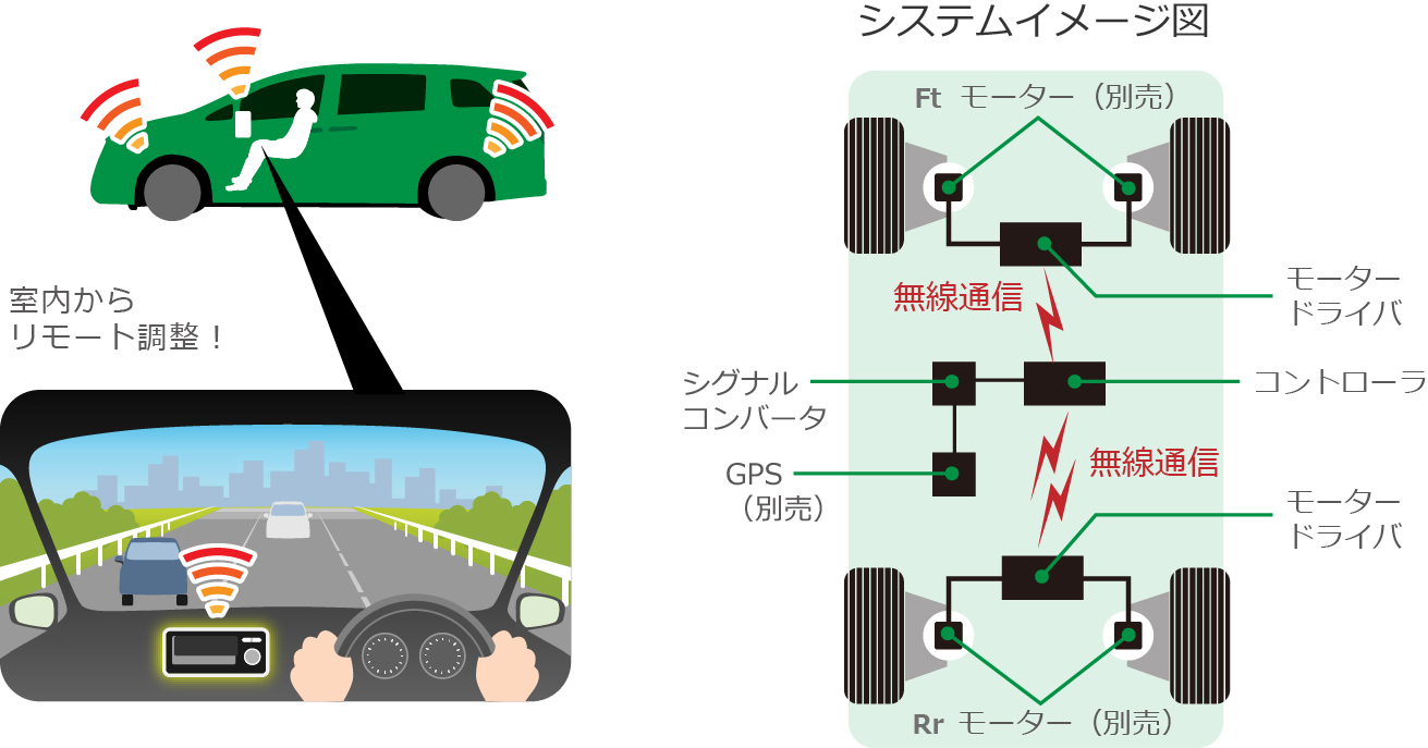 モーターを駆動するためのモータードライバユニット〜コントローラユニット間をワイヤレス通信化することで、バルクヘッド(※)に配線を通したり、室内に配線を這わせるなどの面倒な作業を簡略化しました。※エンジンルームやトランクルームと室内を隔てる壁のこと