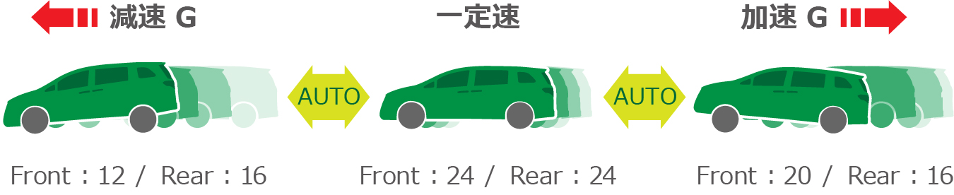 コーナリング等で発生する旋回Gの大きさに応じて減衰力を自動制御。直進している間は減衰力をソフトにして路面の凹凸をスムーズに吸収し、旋回している間の減衰力だけをハードにしてロールスピードを抑えることで、快適な乗り心地とスムーズなコーナリングとが両立できます。