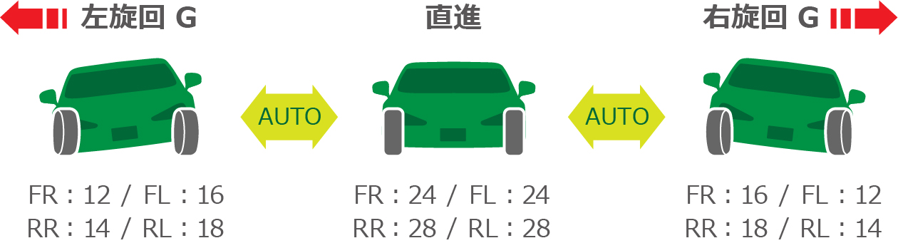 コーナリング等で発生する旋回JERKに応じて減衰力を自動制御。自動調整のプログラムは自由に設定でき、過渡期における旋回荷重のオーバーシュートを抑制し、収束を早めることで旋回性能の向上と乗り心地の両立が可能となります。加減速G、旋回G感応自動調整モード