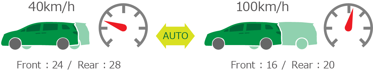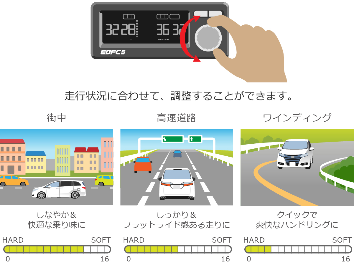 車速に応じて減衰力を自動制御。例えばストリートでは、低速時は減衰力を低めにし突き上げ感のないソフトな乗り心地、高速時は減衰力を高めにし安定感のあるハンドリングを実現するといった事ができます。