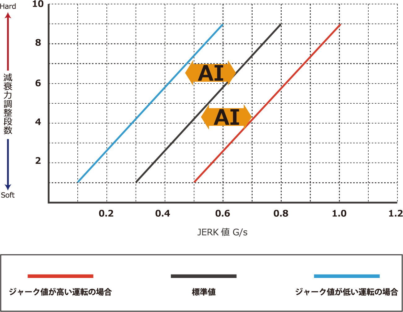 走りの傾向を学習することにより、ジャーク制御の効く量をAI補正します。例えば高速道路や一般道、ワインディングやサーキットなど、それぞれのステージでクルマの動きが違いますが、学習することによってどんな走行シチュエーションでも違和感のない、適切なジャーク感覚を実現します。