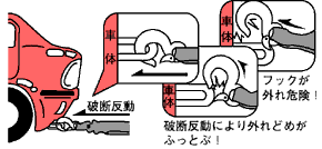 従来タイプのフックでは破断反動により車両フックとの接続が外れ、飛び跳ねが起き