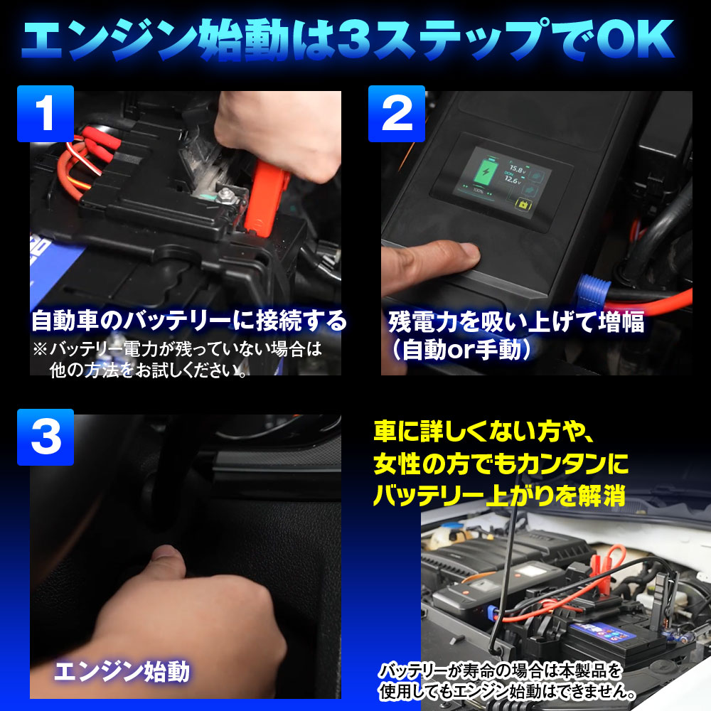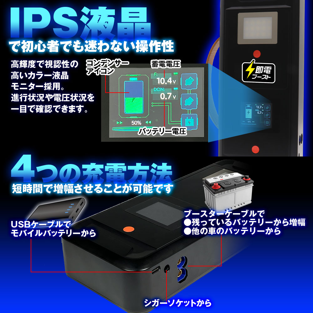 ■充電いらずで10年使える。スーパーキャパシタ搭載安全ジャンプスターター