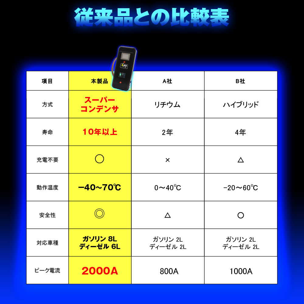 2500Fの大容量コンデンサ搭載でバッテリーレスなので充電不要。放置しても劣化せず、いつでも即使用可能。長期保管も安心です。マイナス40℃の極寒地でも使用可能。ピーク電流が2000Aの大電流なので大型車にも対応します。
