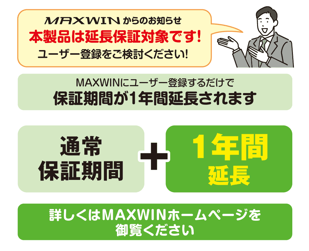 保証期間:最大2年保証(通常1年保証、メーカーサイトユーザー登録で2年保証)
