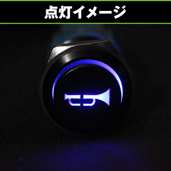 | 【商品説明】 社外ホーンやエアーホーン、ラッパなどの増設スイッチとしてお使い頂けます。 ブルーLEDタイプ。 マーク付きですので車検に対応します。 |