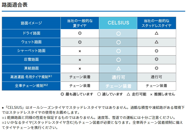 ※日常的に積雪路や凍結路を走行する場合は、スタッドレスタイヤへの交換を推奨。