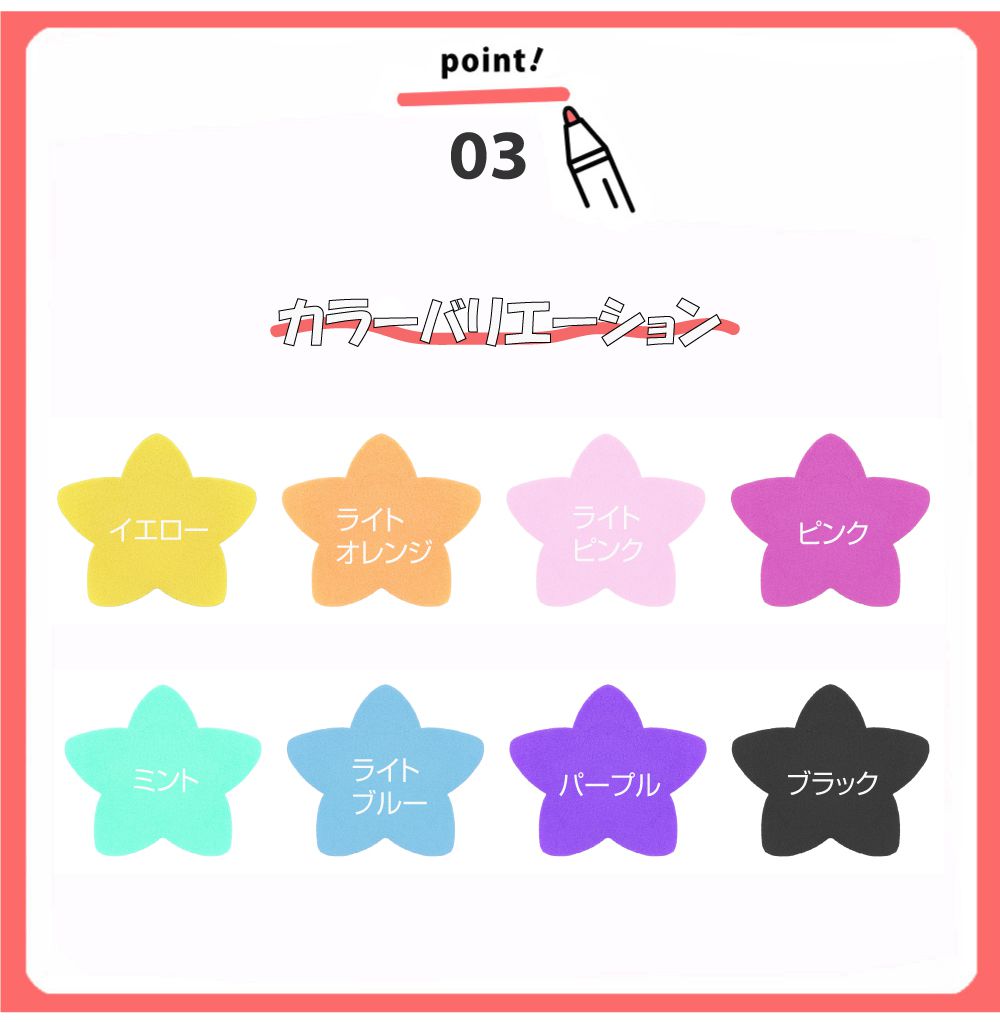 | カラー | ・イエロー ・ライトオレンジ ・ライトピンク ・ピンク ・ミント ・ライトブルー ・パープル ・ブラック |