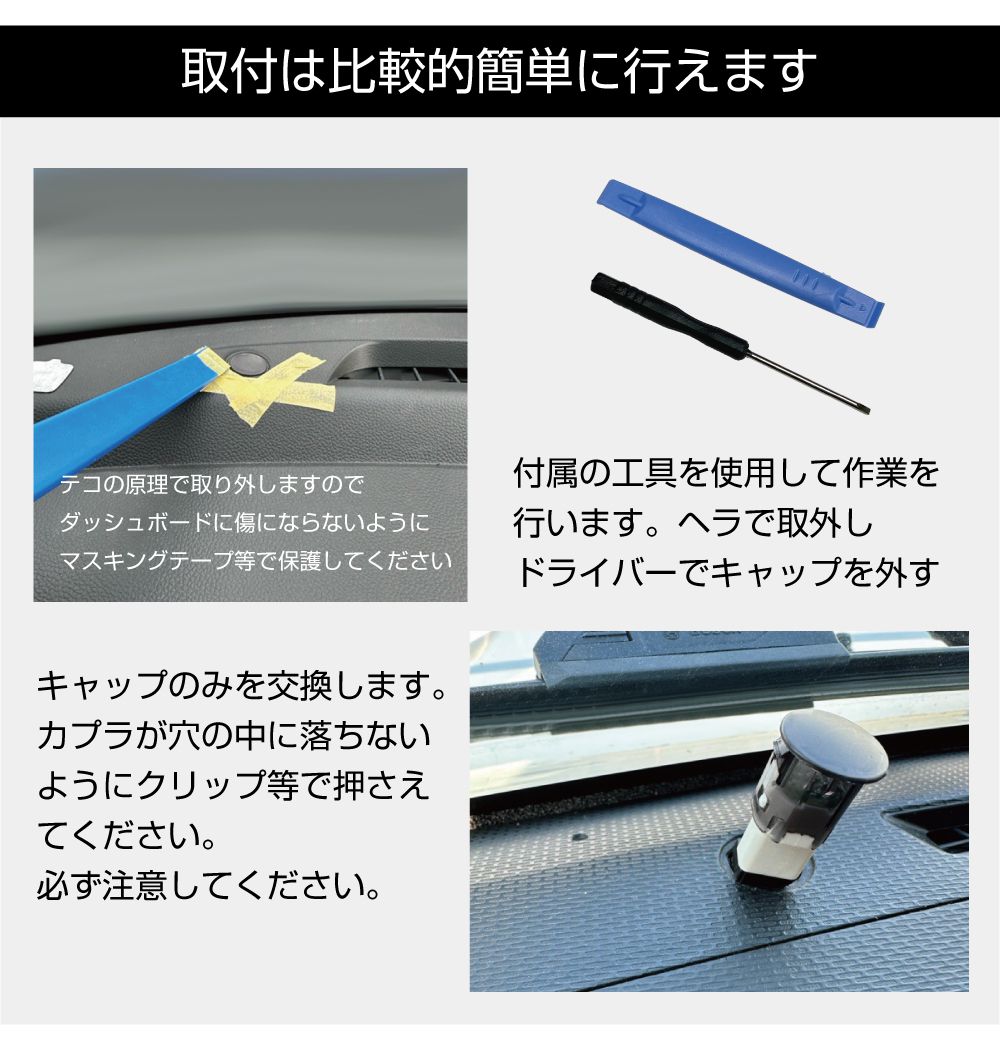 | 特徴 | ダッシュボードにあるオートライトセンサーのカバーの色を薄くすることでヘッドライトやバックライトの自動点灯時間を遅らせることができます。 取り付け作業に便利なヘラとドライバーをセットにしてお届けします。 |