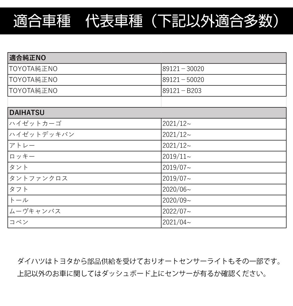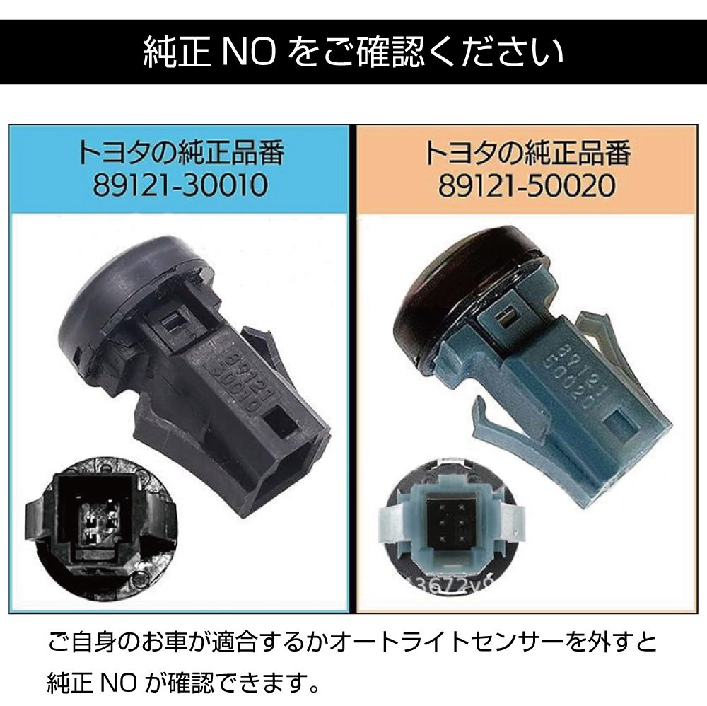 | 適合TOYOTA純正センサー品番 | 89121-30020 89121-50020 89121-B203 オートライトセンサーはトヨタより部品供給されています。 |