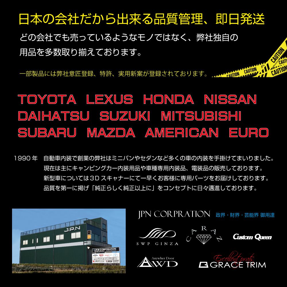 | 注意事項 | ※自信の無い方はプロショップへの取り付け依頼をオススメいたします。 ※どのような場合でも、取付工賃や破損部品などの保証は行っておりません。予めご了承ください。 ※適合車種欄に記載されている車両でも、年式・グレード・オプション等の状況により適合しない場合がございます。予めご了承ください。 ※記載のデザイン・形状をお取り付けを行う車とよくご確認の上、お買い求めください。 ※デザイン又は仕様の一部が予告なく変更となる場合がございますのでご了承ください。 ※ご使用の機器やモニターによって実際の商品と色味が異なる場合がございます。予めご了承ください。 |