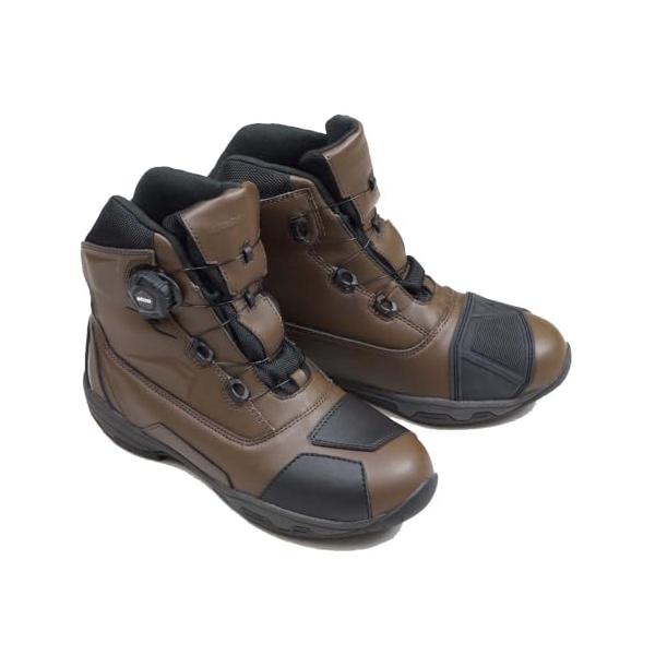 Vibramソールを採用した軽量防水透湿ダイヤルシューズ 圧倒的にスピーディな着脱を可能にするダイヤルワイヤーシステム「a-top」、アウターソールのトップブランド「Vibram?ソール」のうちモーターサイクルに最適なものを採用した、ラフアンドロードが送る防水透湿ライディングシューズ。デザインされた幅広シフトパッドや被視認性を高めるリフレクター、整形くるぶしガードなどを装備したハイカットブーツでありながら、片足でわずか500g以下の超軽量化を実現しました。防水・透湿・軽量で、通勤通学などのシティユースからロングツーリングまで幅広く活躍できるライディングシューズです。