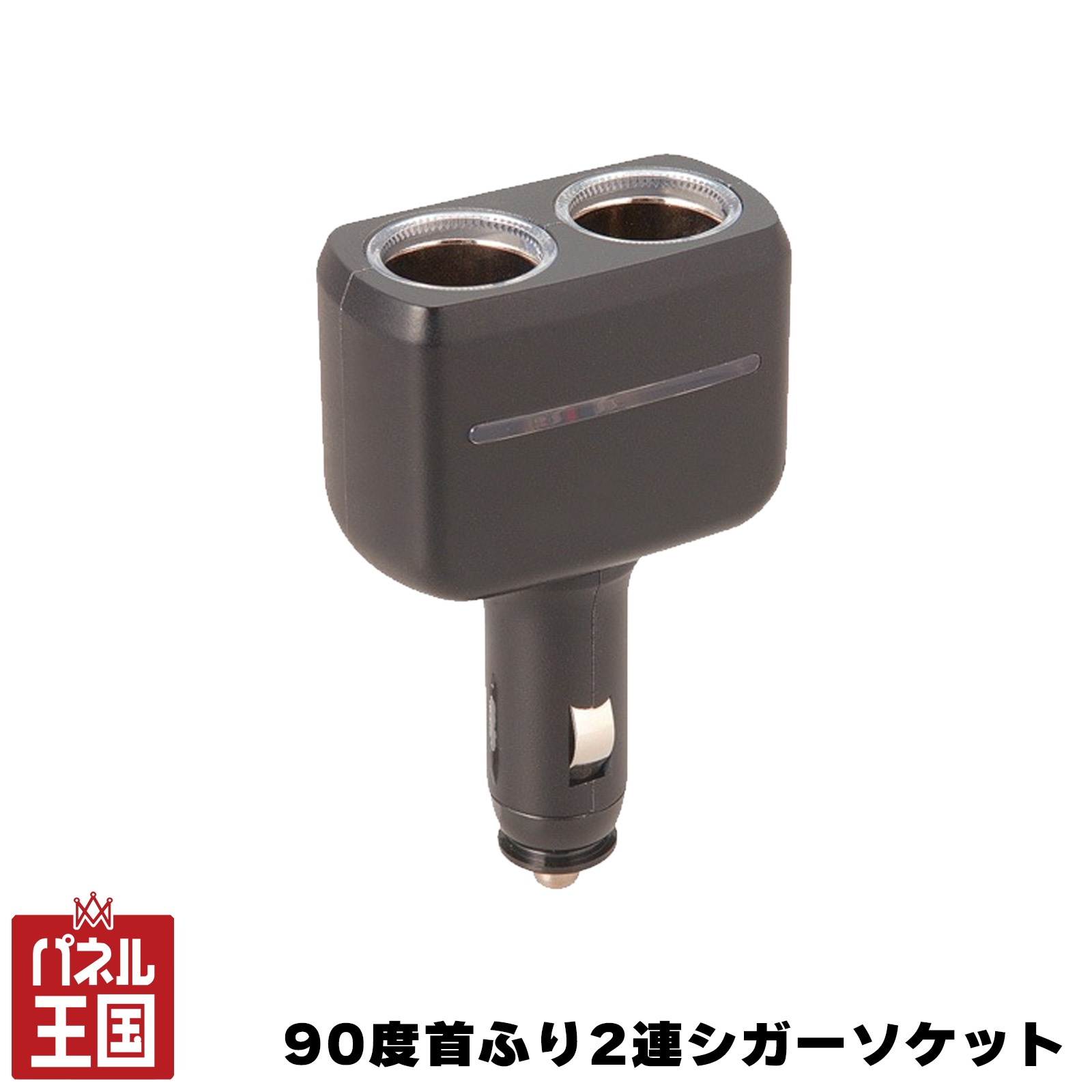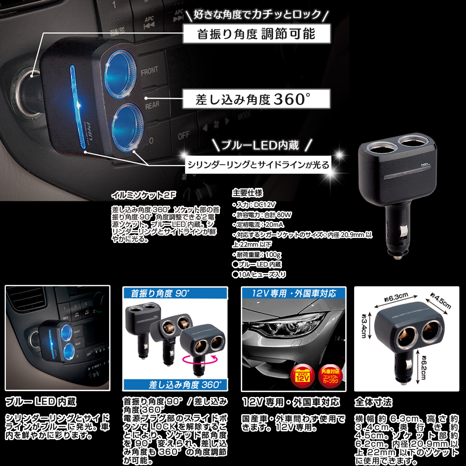 | 車のシガーライターソケットに差し込み、電源を2極に分配できます。 プラグ部のスライドボタンでLOCKを解除することにより、ソケット部角度を90°の範囲内で変えられます。また、差込角度で360°向きを変えられます。 シリンダーリングとサイドラインが、ブルーに発光します。(ブルーLEDを使用) 接続できる電気製品の合計消費電力は110Wまで対応できます。 |