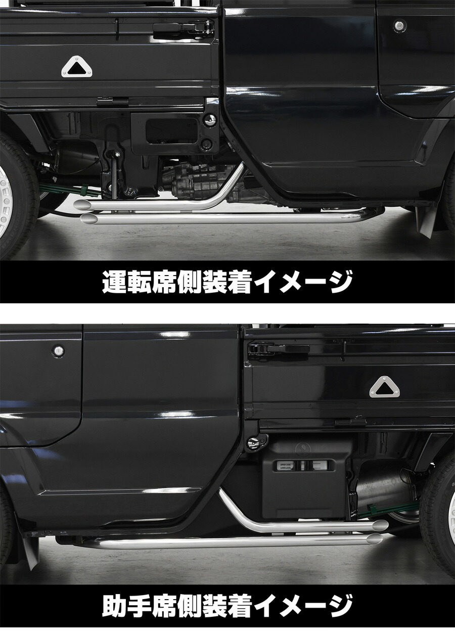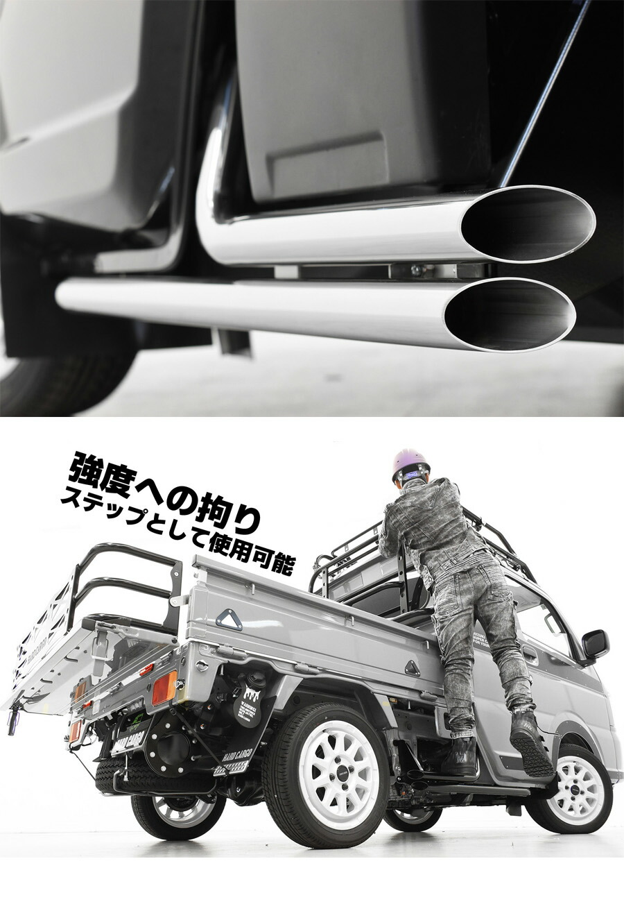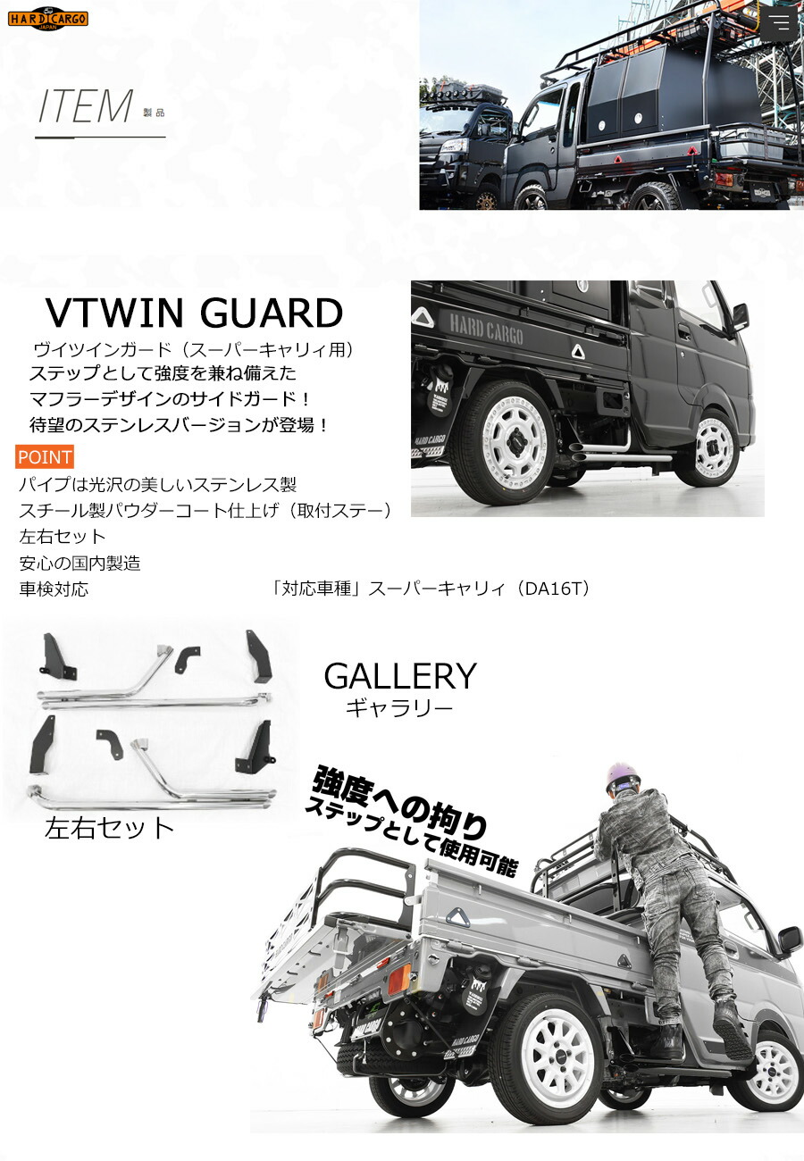 ![]() ![]() ![]() ![]() ![]() VTWIN GUARD ヴイツインガード ステップとして強度を兼ね備えた マフラーデザインのサイドガード! 待望のステンレスバージョンが登場! POINT パイプは光沢の美しいステンレス製 スチール製パウダーコート仕上げ(取付ステー) 左右セット 安心の国内製造 車検対応 商品説明 こちらの商品は実際にステップとしてご使用いただけます。 対応車種 ・スーパーキャリイ(DA16T) セット内容 ・Vツインガード本体左右セット ・取付ボルト一式 ![]() ![]() ![]() ![]()